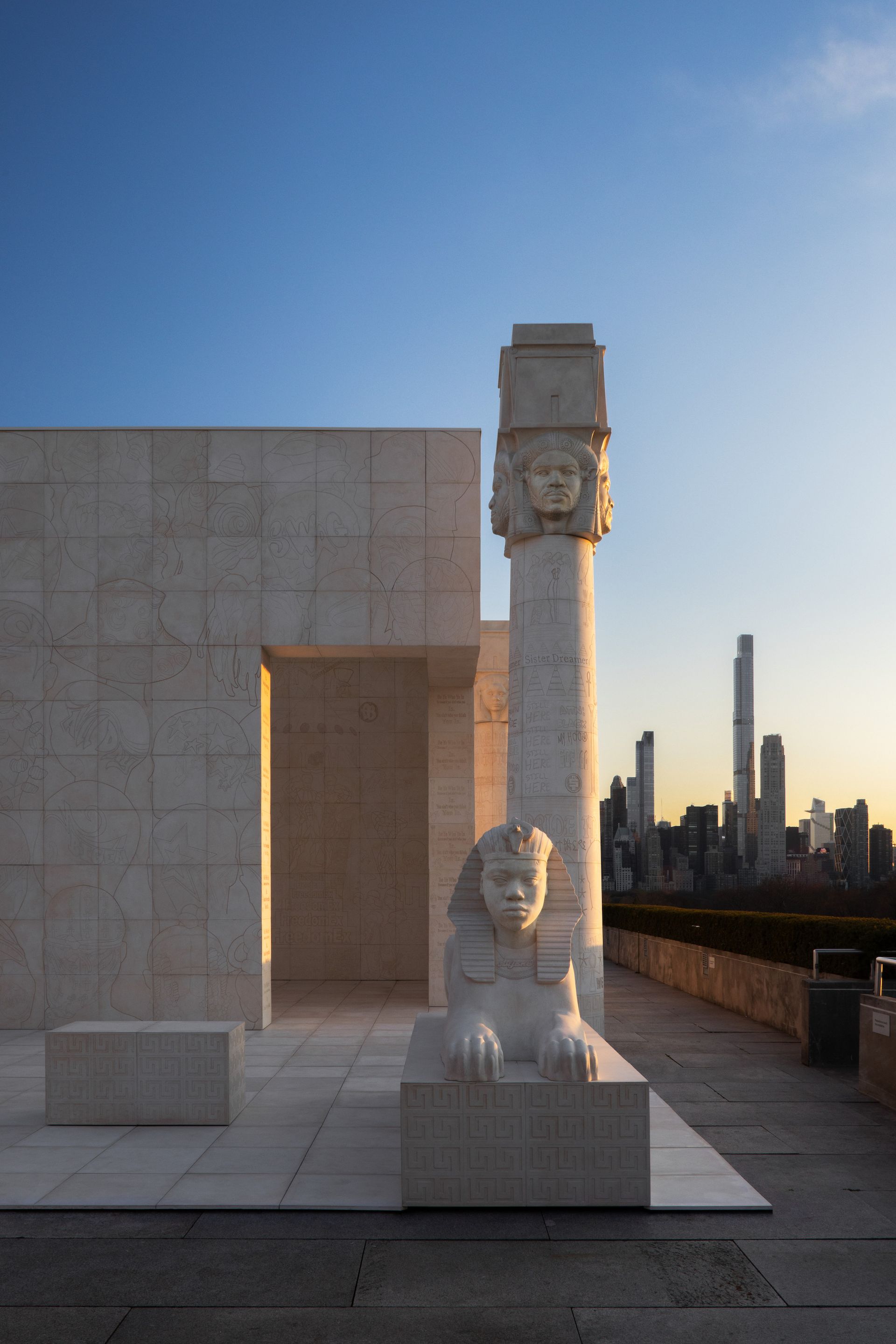 The fusion of ancient and modern forms and icons resonates with the grandiose rooftop setting. “On the one hand, it’s in conversation with Cleopatra’s Needle, the obelisk that’s just nearby in Central Park,” says Abraham Thomas, the Met’s curator of modern architecture, design and decorative arts, who co-curated the commission with Sheena Wagstaff. “But it’s also in conversation with the roof of the museum’s Robert Lehman Wing from 1975, which is an eight-sided glass pyramid.”