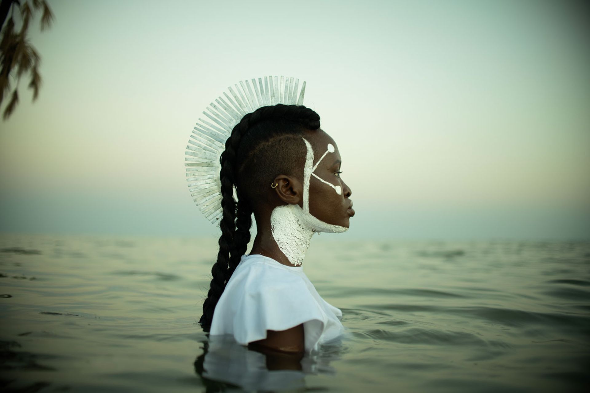 Mourine Apuu in a shot from Oil + Milk, a project of Turkana Artist Xchange which addresses the discovery of oil in Turkana by personifying the properties, black and white, of two liquids which have great significance in the region Artist & model: Mourine Apuu; photographer: Migwa Nthigah