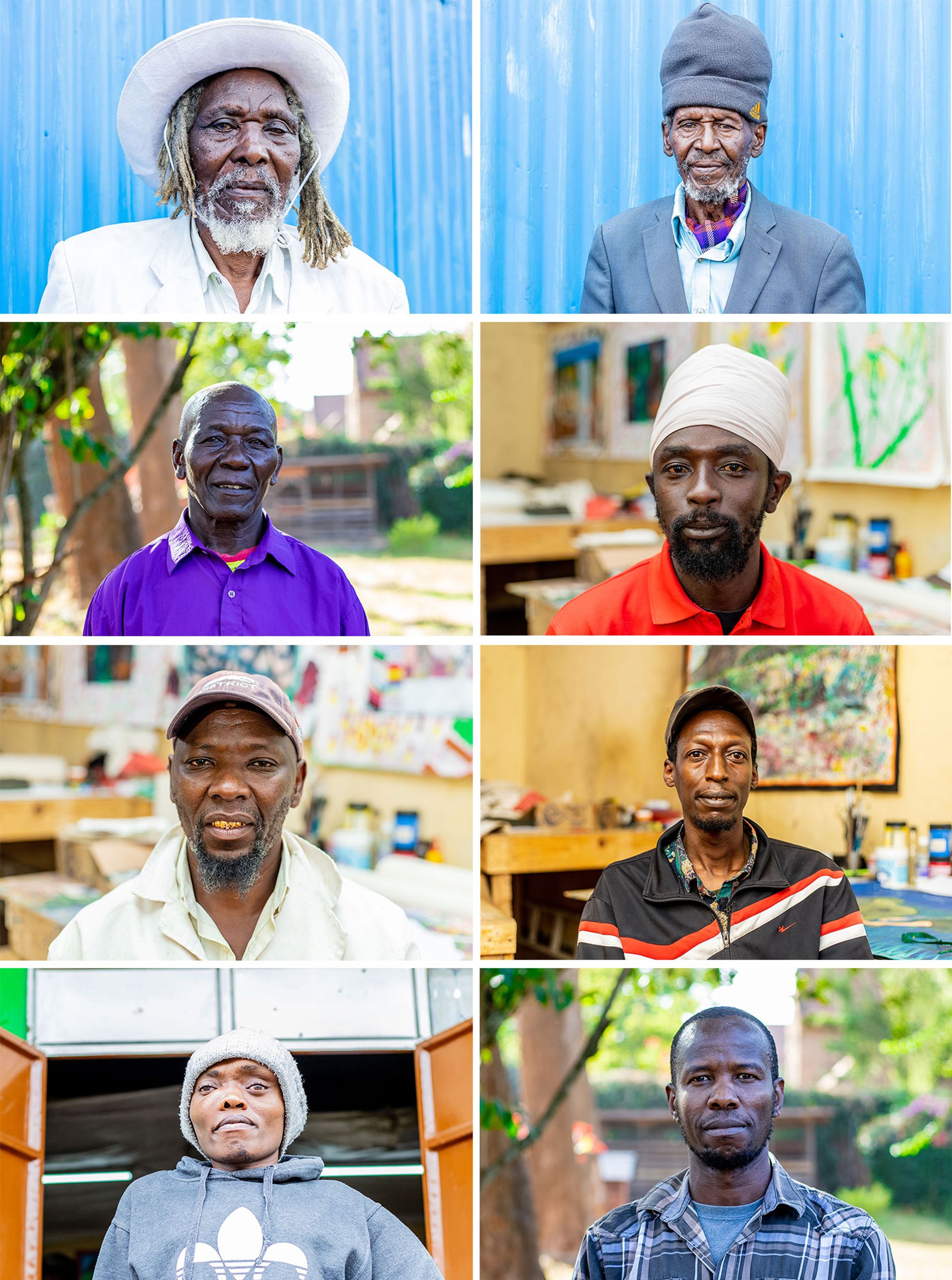 The Pamoja collective, in portraits by Jed Kamuyu, from top row to bottom: Elizaphanson Mwangi Gibson (left) and Gabriel Macharia; Nathaniel Kiboi (left) and Nicholas Njenga; Gibson Kuria Mwangi (left) and Marimbe Parsimei; Macharia Mwangi (left) and Solomon Misigo Jed Kamuyu