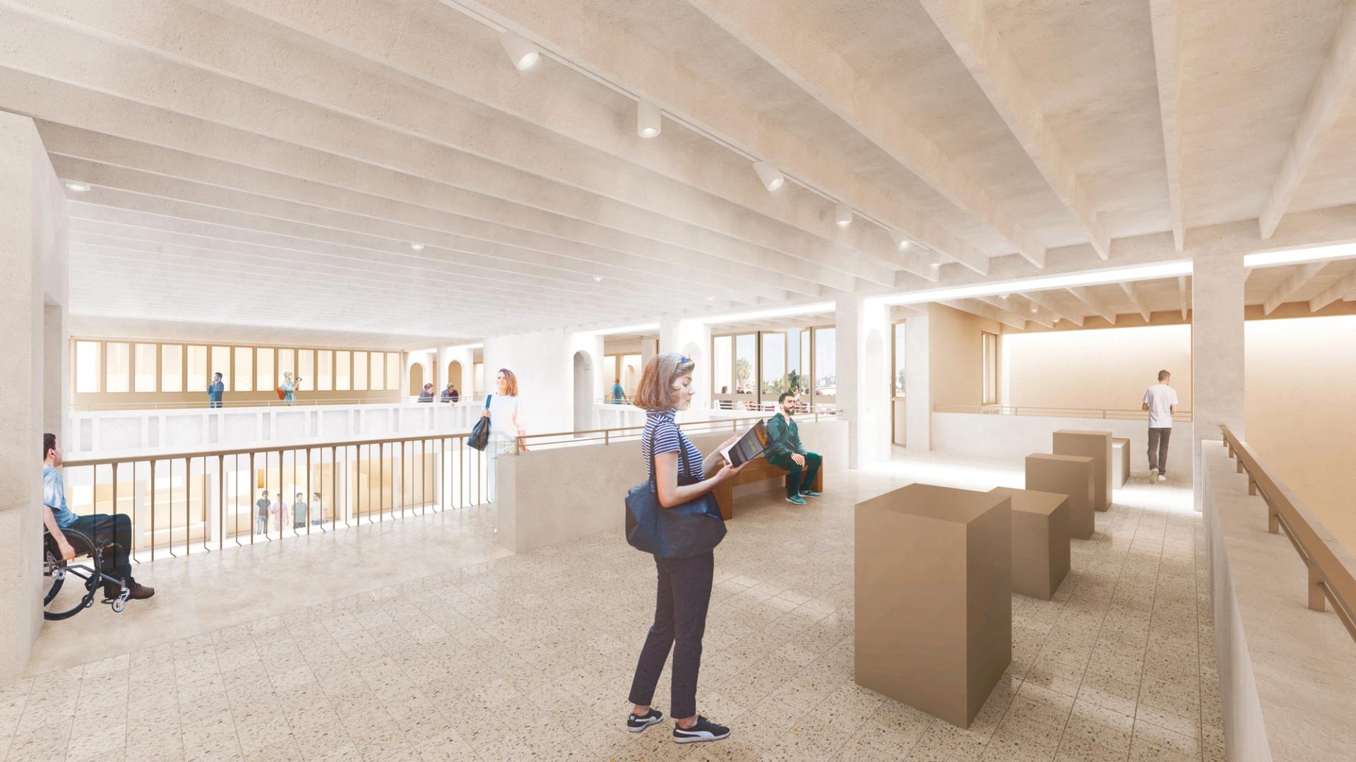 Rendering of the mezanine floor of the Mosul Cultural Museum, due to reopen in 2026; the restored building follows the original architect Mohamed Makiya’s plans © World Monuments Fund; Donald Insall Associates