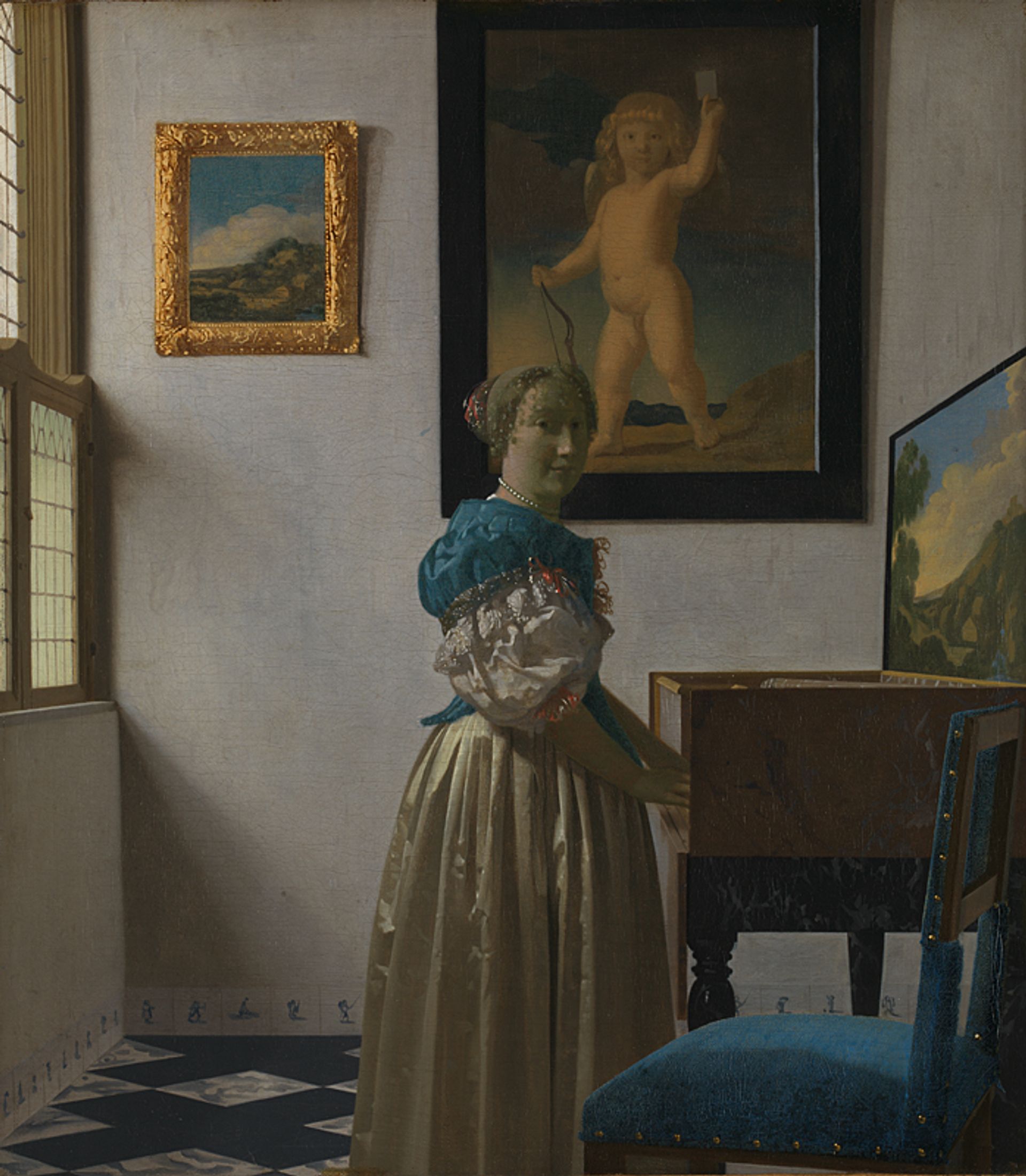 A woman in profile intently reads a letter by an open window in this painting that was transformed when it was restored in 2021. A layer of later overpainting was removed to reveal a picture hanging on the wall at the back of the composition. This turned out to be of Cupid, the same work which appears in the National Gallery’s A Young Woman standing at a Virginal.