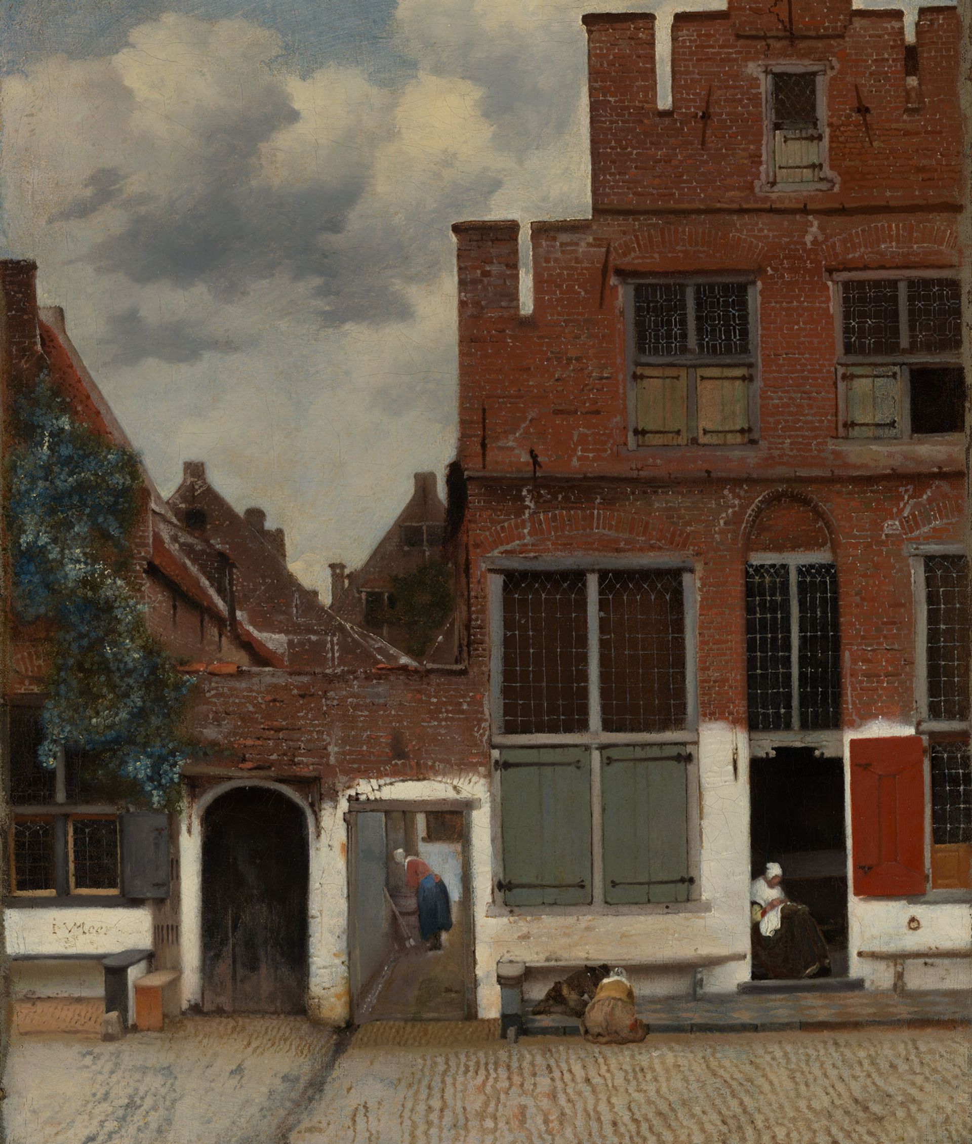 Vermeer’s only street scene shows part of two houses in his hometown of Delft in the southern Netherlands. There is a timeless quality to this peaceful scene, in which two women work quietly while two small children play beneath a bench. In 2015 a Dutch specialist identified the location depicted by Vermeer as Vlamingstraat, although the original houses were demolished in the late 19th century.