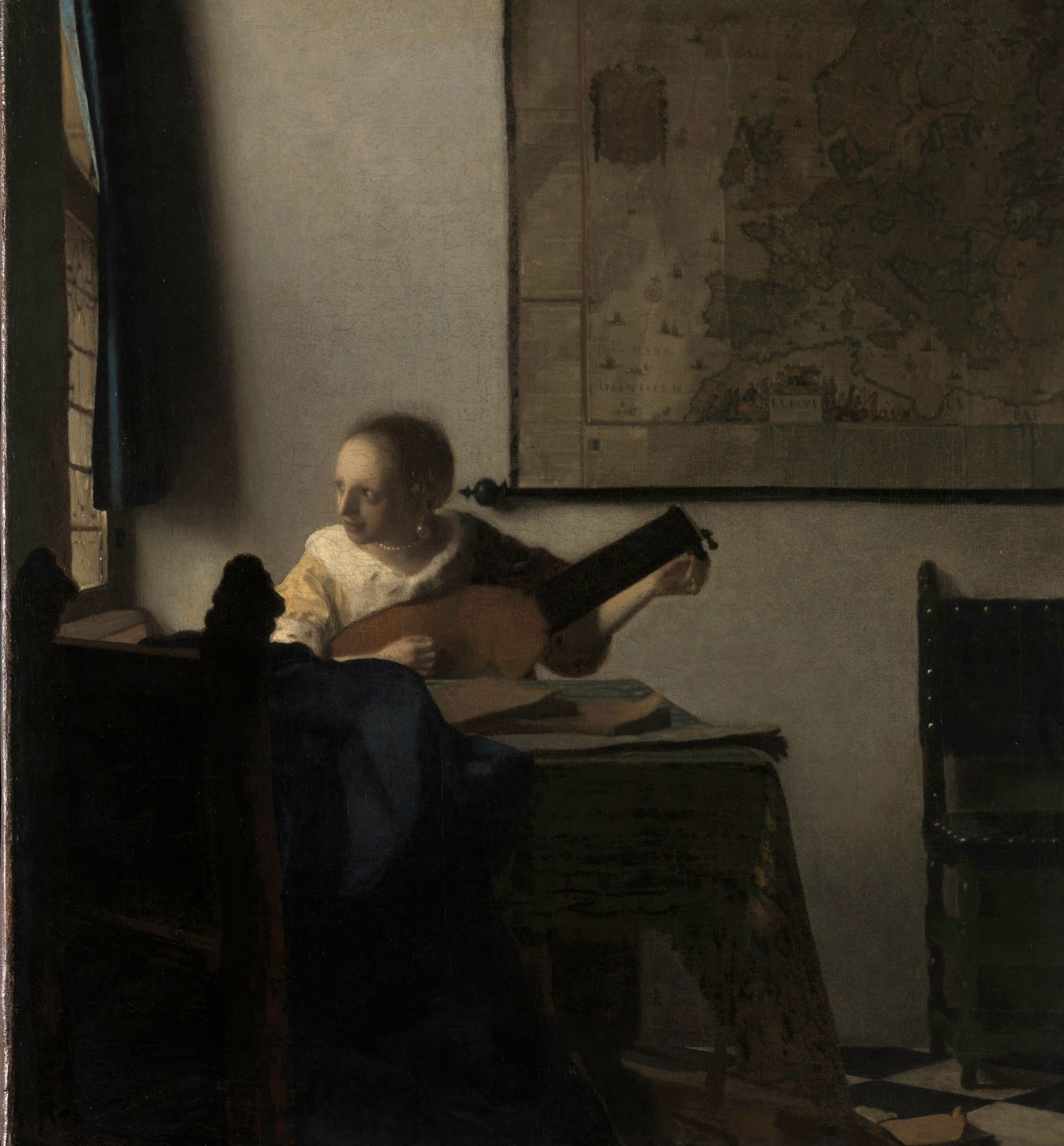 The lady is tuning her lute and gazes out of the window as she adjusts the peg. What, we wonder, is she watching outside the confines of her room? Behind her hangs a map of Europe, suggestive of the wider world that lies beyond.