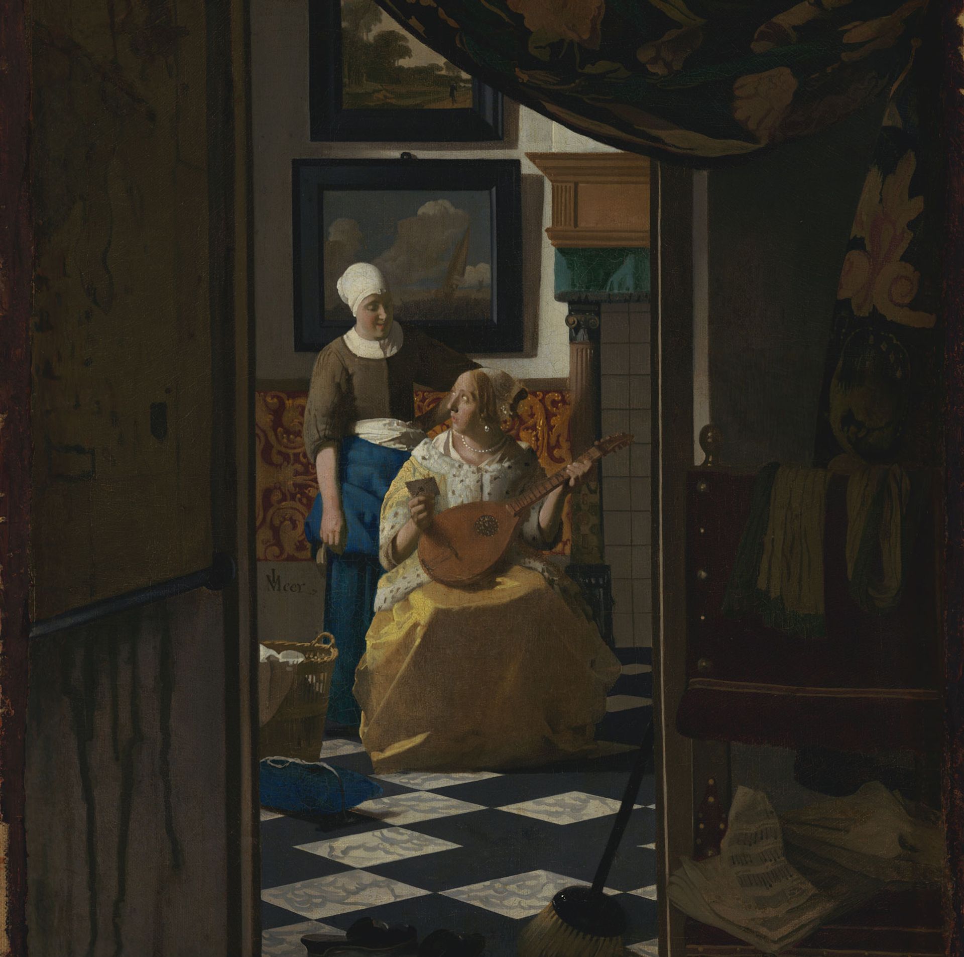 Another of Vermeer’s enigmatic letter paintings shows the mistress of the house with a slightly worried expression after being handed a letter by her maid. Dressed in an elegant jacket, she has been interrupted while playing a cittern. The room is viewed through a doorway, partly framed by a tapestry drape.