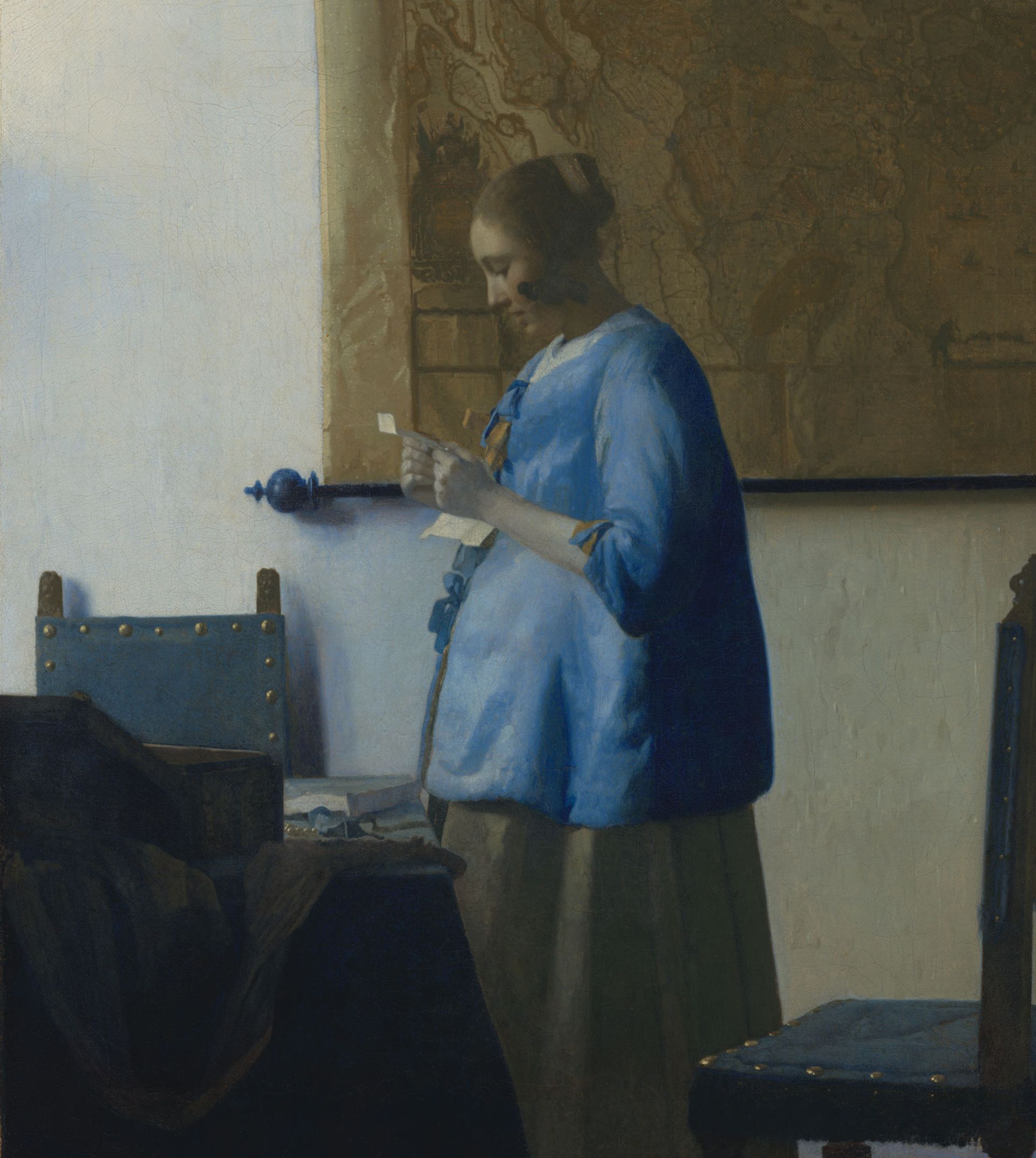 A woman stands by a table, illuminated by a window which is just out of sight. The light catches the letter which she is reading intently. Her profile suggests she might be pregnant, although this is uncertain. The map behind her on the wall makes a link with the outside world. Even though the woman is alone, the presence of the letter writer is palpable.