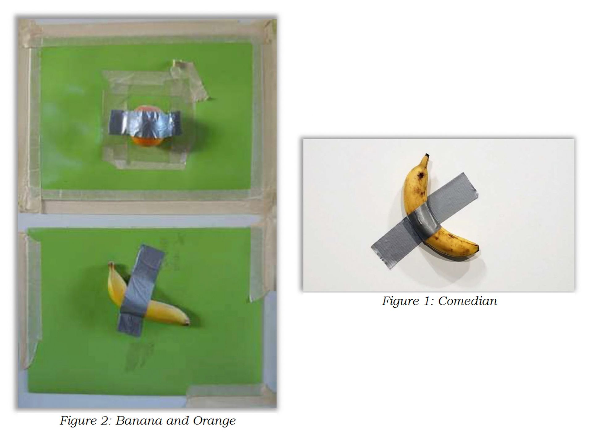 Joe Morford's Banana and Orange (left) and Maurizio Cattelan's Comedian Court documents