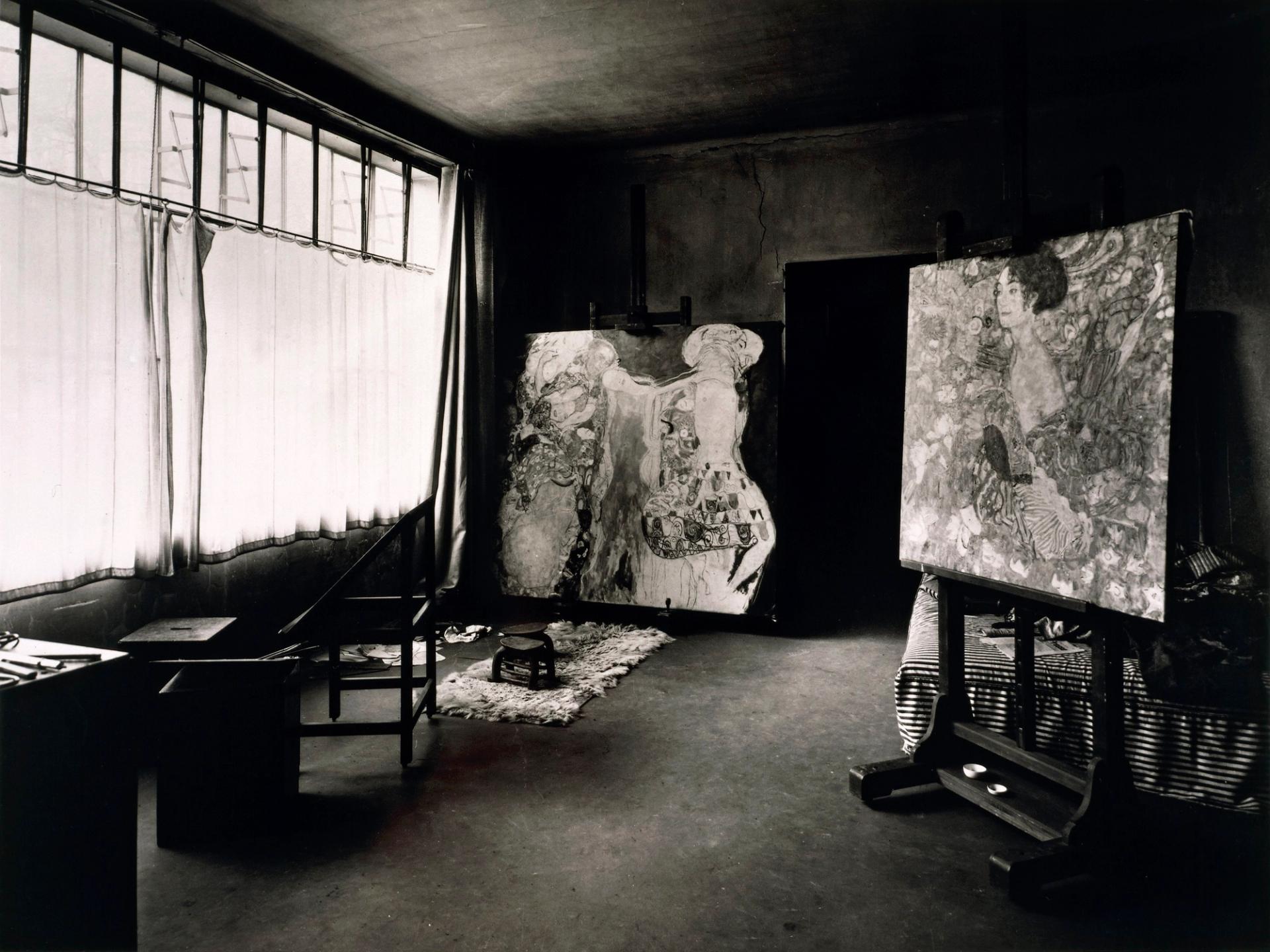 Dame mit Fächer on an easel in Klimt’s studio, 1918