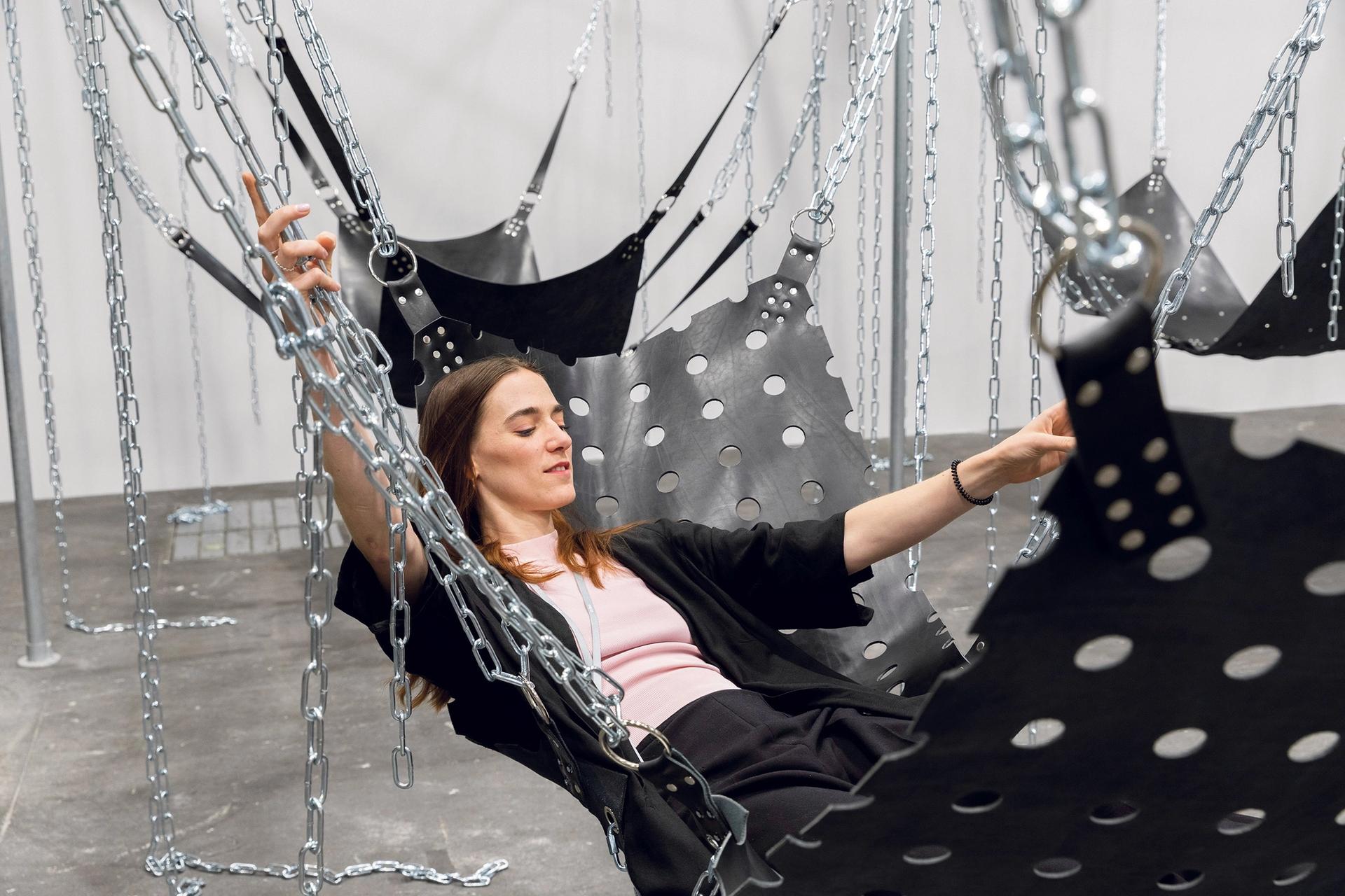 “We all know Bonvicini’s work is about power, sexuality, architecture. I think this is a very representative piece; she often uses the sadomasochistic aesthetic with black leather and chains. I’ve followed her work for many years and I’m very happy to be able to show an important piece of hers after her retrospective in Berlin. This is an interactive work; people can sit on the chairs. Ideally you have to share—the swings are for two—so it’s also a piece about the interaction between human beings.”