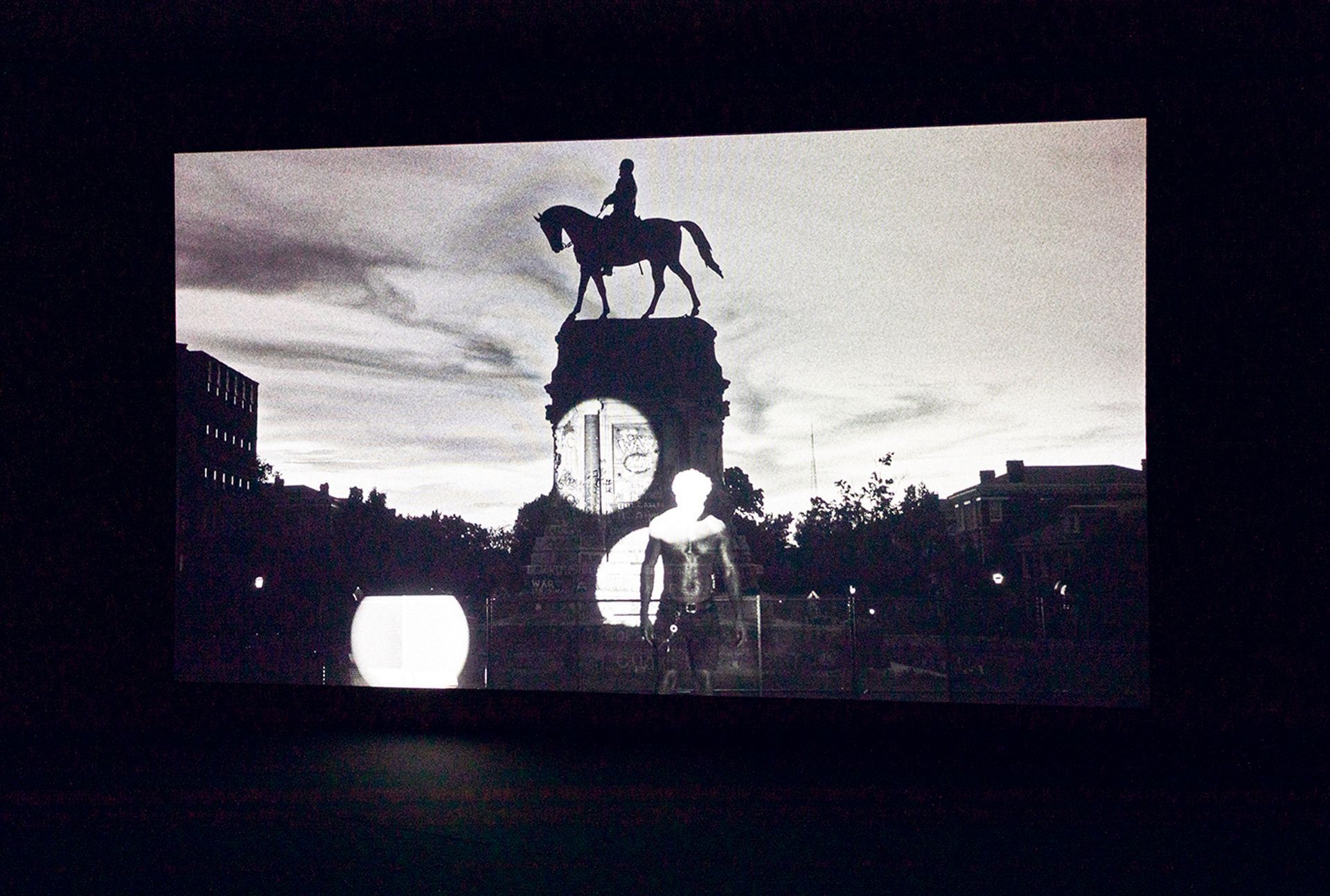 “This is a very powerful Pendleton piece, not only because his aesthetic is at the top but also because it speaks of the topics that define his practice: Black community, reclaiming space. He’s a very formal artist and very precise in his work. Through editing, he has managed to erase and transform the monument of Confederate general Robert E. Lee, which was controversial in the southern states of the US. The film focuses on the image of this monument but, by projecting lights on it and cutting it, he gives the monument a totally new meaning.”