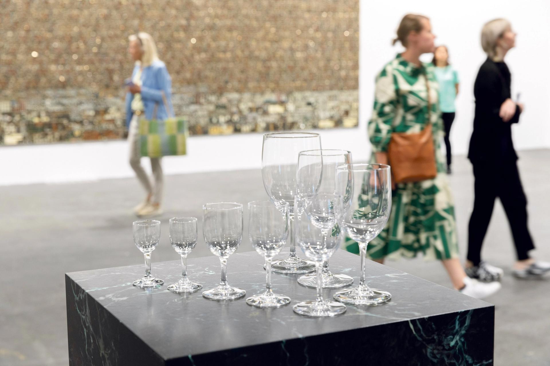 “We worked a lot with Kimura to find the right placement for this piece. All these objects on plinths are about reflection, so we needed to find the right space where other artworks are reflecting into it. Reflections are generated by natural materials like mother of pearl or by stainless steel or glass reflecting on vinegar. It’s a peculiar piece because we have monumental works here and this is rather quiet and poetic, with small things that could get lost with the mass of people coming and going through Unlimited. It’s interesting in this context to have a piece like this.”