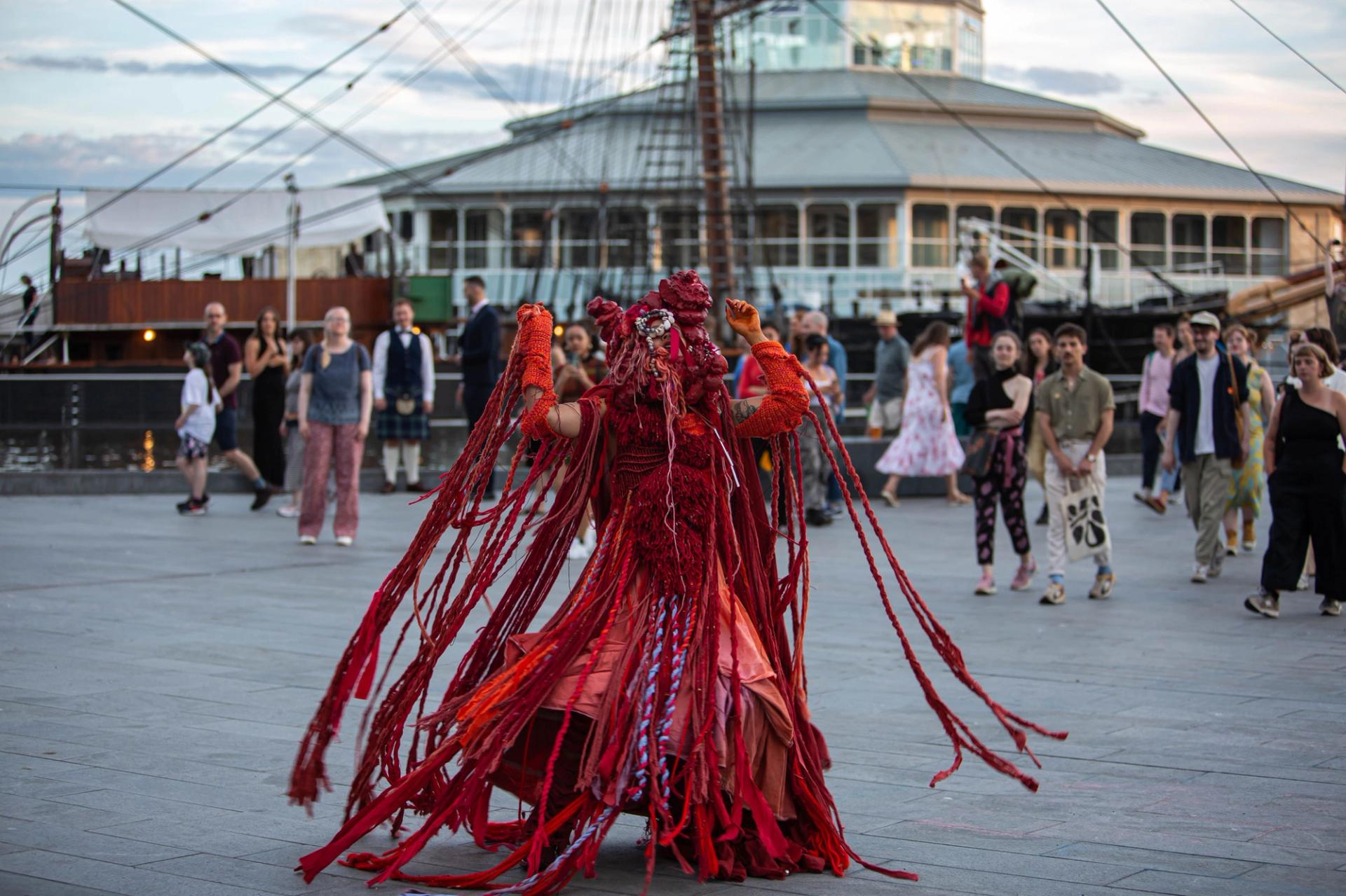 McKenzie’s and Phillipson’s exhibitions will both remain in situ until early July, while Dundee based Saoirse Amira Anis’s film and installation breach of a fraying body is currently on view at Dundee Contemporary Arts (DCA) until 6 August. One of the many Dundee-based artists playing a prominent part in Art Night, Anis draws on both her Scottish and Moroccan heritage to create a mysterious, rope laden deity that lives partly in and out of the water. For Art Night she brought this creature to life as an elaborately masked and somewhat sinister figure—clad in a tattered, beaded crimson cloak—who scuttled, swooped and swished from DCA down to HMS Unicorn, a wooden navy frigate moored on the waterfront. Here she flung the mask as an offering into the River Tay, site and source of so much of Dundee’s wealth, trade and vexed histories.
