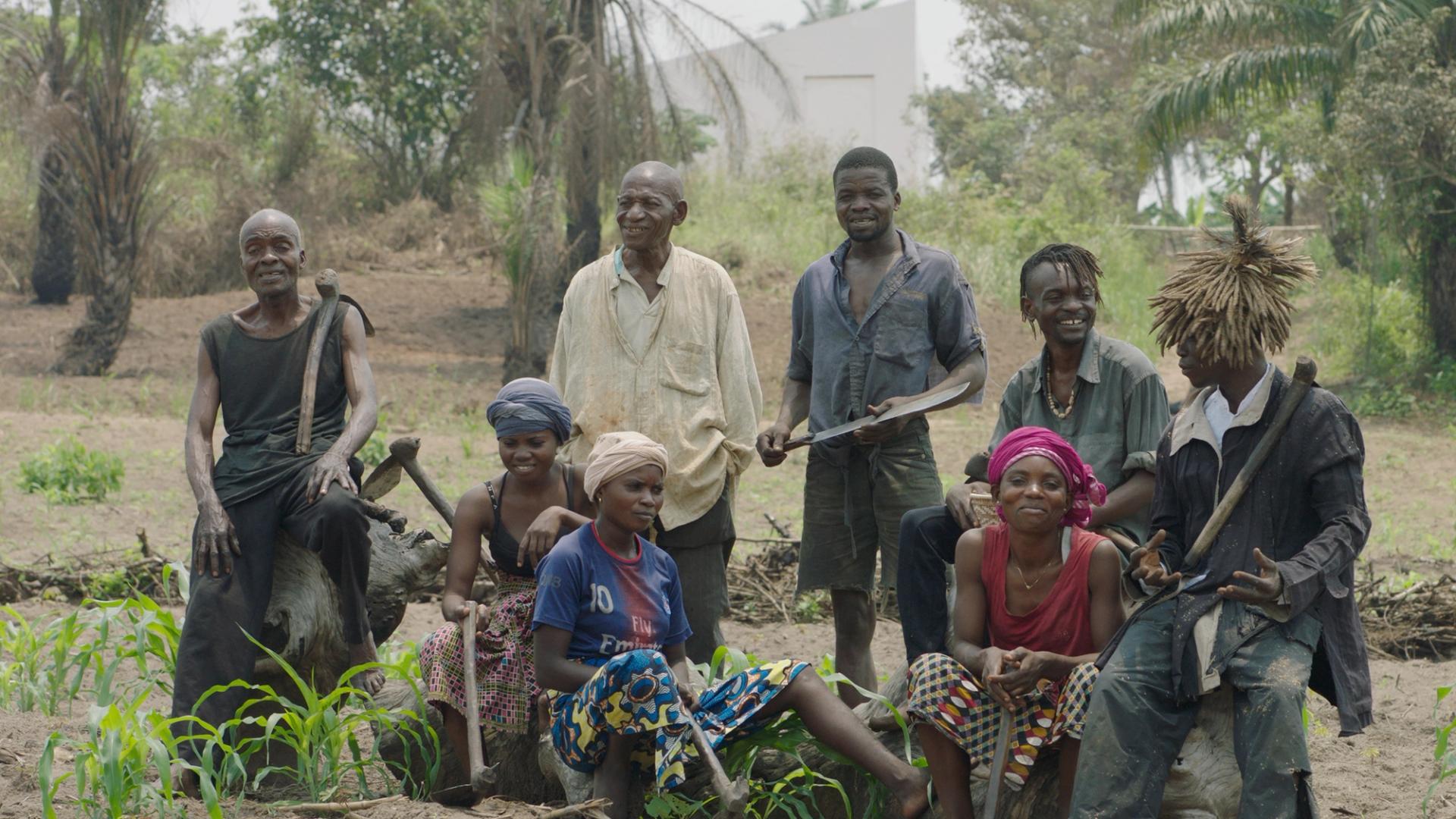 CATPC members (from left) Olele Mulela Mabamba, Huguette Kilembi, Mbuku Kimpala, Jeremie Mabiala, Jean Kawata, Irene Kanga, Ced’art Tamasala and Matthieu Kasiama, still from White Cube, Renzo Martens © Human Activities, 2020, courtesy Manchester International Festival