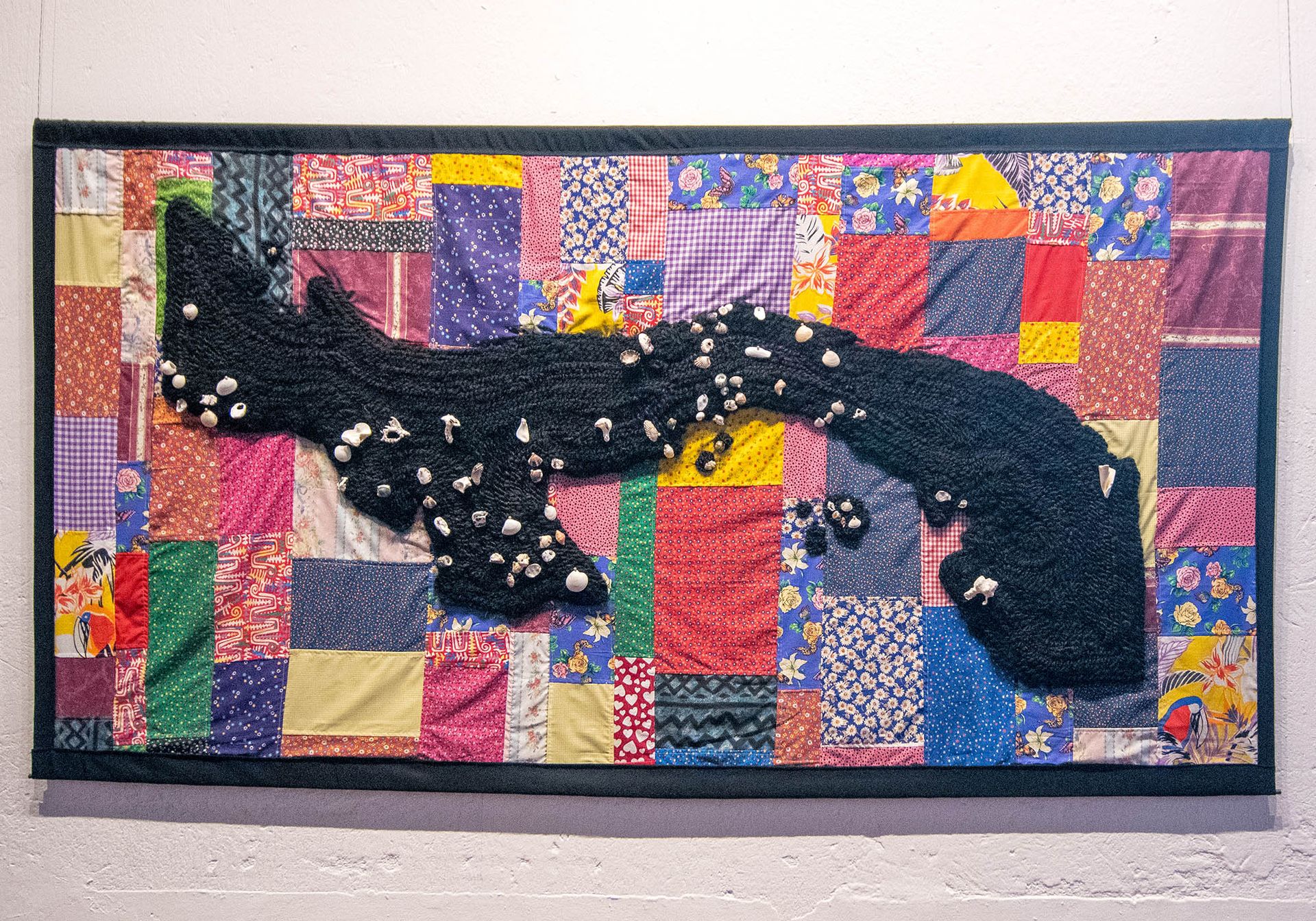 The Panamanian artist Risseth Yangüez Singh explores the notion of intergenerational mapping in Panamáfrica (2023), a textile work made in collaboration with her grandmother that shows the map of Panama. Created from braided hair and shells, the work marks places with African names and their derivations in the territory. The work is presented with the video performance Hacerme un capullo (Make myself a cocoon) (2023), in which Singh, with the help of close friends, braids herself into a cocoon of hair as a communal and meditative act of care using a politicised, organic material. The curators note the musical quality of this gesture, explaining that Singh “question[s] her experience as a Black woman, drawing new lines, like sheet music in her hair”.