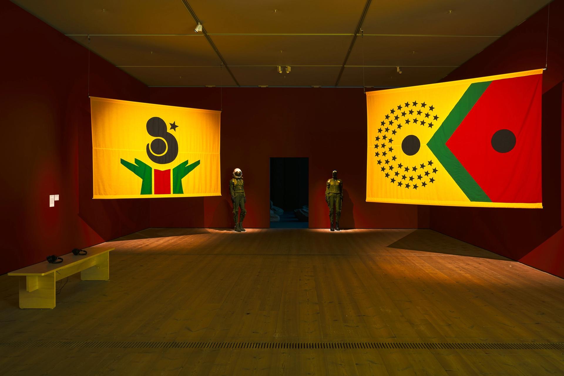 Installation shot of Larry Achiampong's Pan African Flags for the Relic Travellers’ Alliance (2017) at Baltic centre for contemporary art