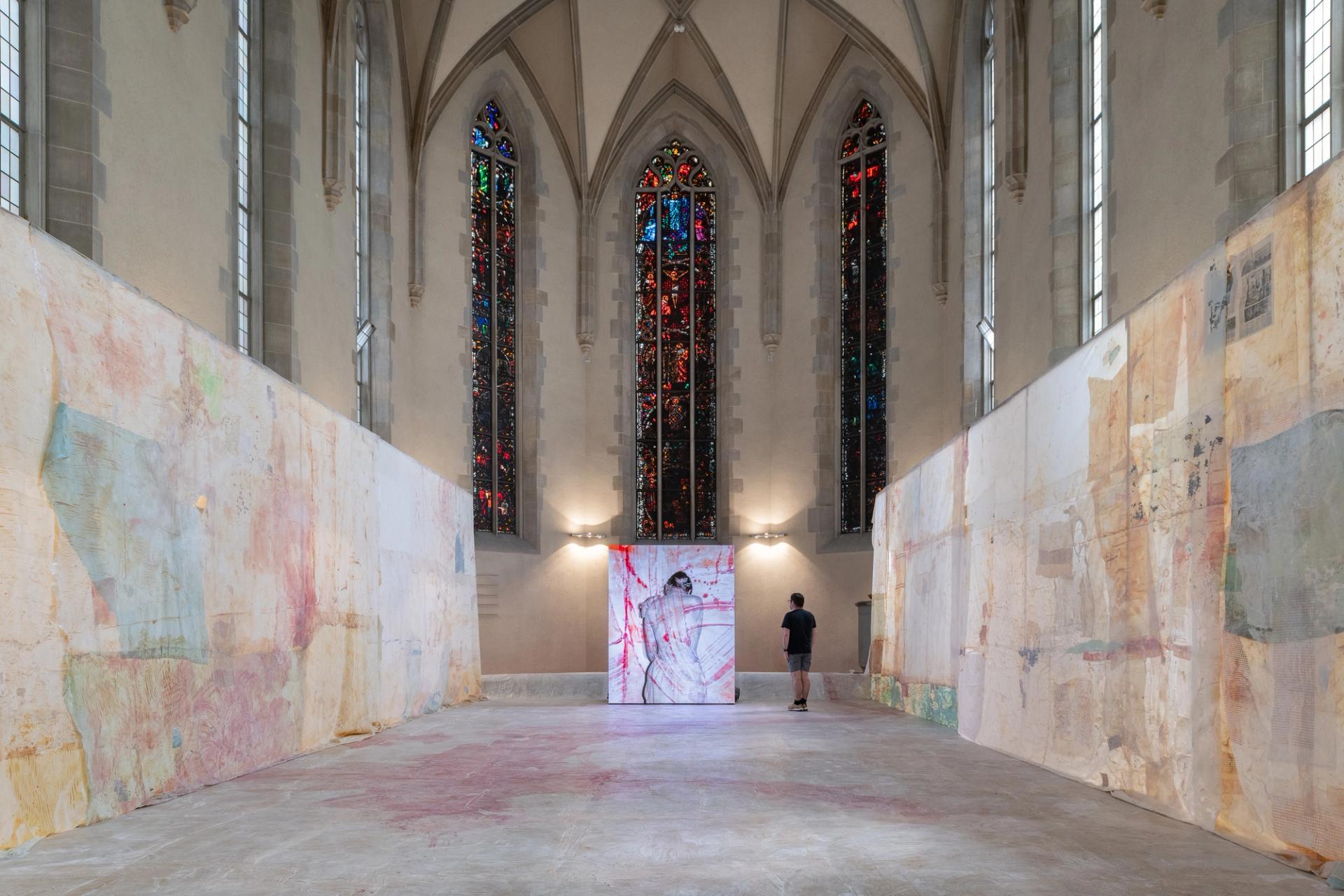 Installation shot of Mandy El-Sayegh's Enfleshing (2023) at Wasserkirche, Zürich. Part of the exhibition In Session at Tichy Ocean Foundation, Zürich, 2023