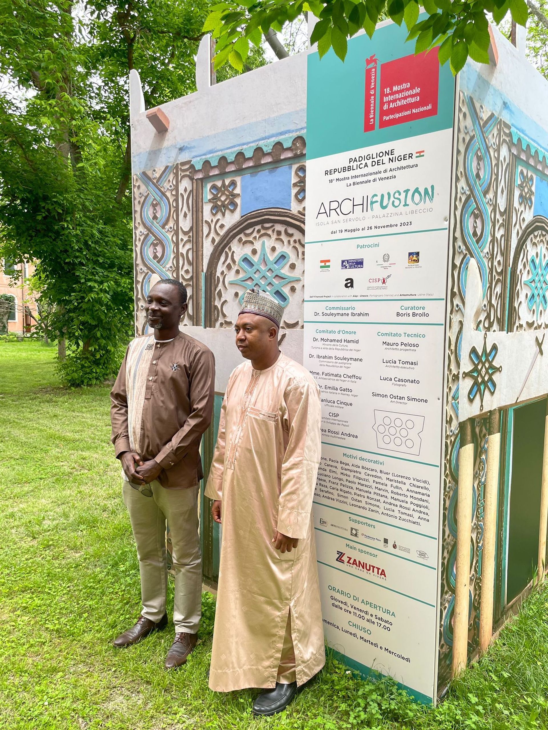 Souleymane Ibrahim (left), commissioner of Niger's presentation at the 2023 Venice Biennale of architecture, and Mohamed Hamid (right), Niger's former Minister of Culture, Tourism and Crafts, at the opening of Archifusion Courtesy the Pavillion of the Republic of Niger at the Venice Biennale