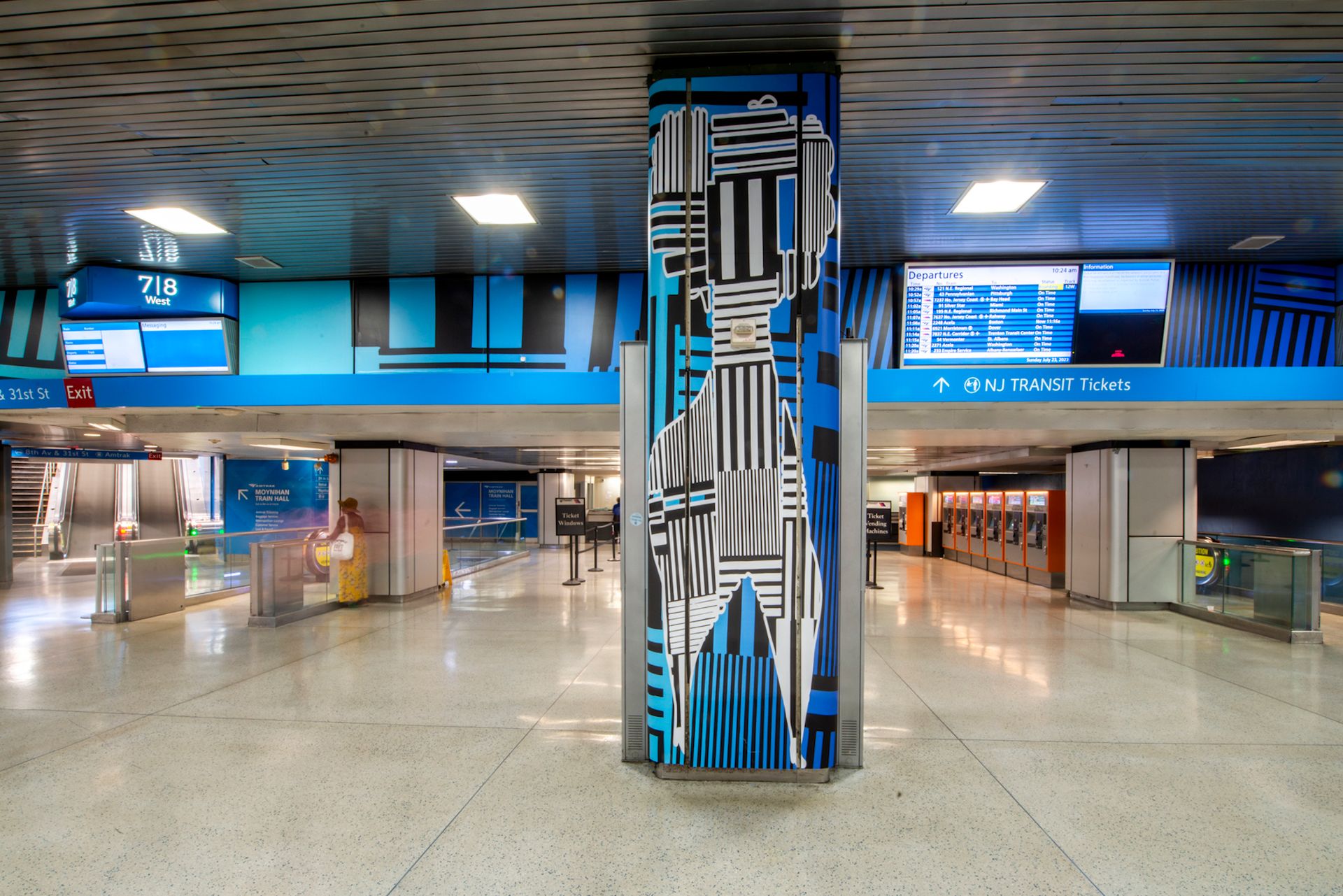 On the nearby concourse, Weinberger has created Traveling Through Horizons (2023), an installation that brings the sky underground, with a gradient of colours—from early-morning orange to crepuscular blue—overlaid with geometric patterns that evoke modern architecture or the city grid. On the concourse’s columns, silhouetted figures rendered as patterns of stripes, loom over passing travellers. For Weinberger, the figures reflect her hybrid, Afro Caribbean and American heritage, as well as marginalised identities more broadly.