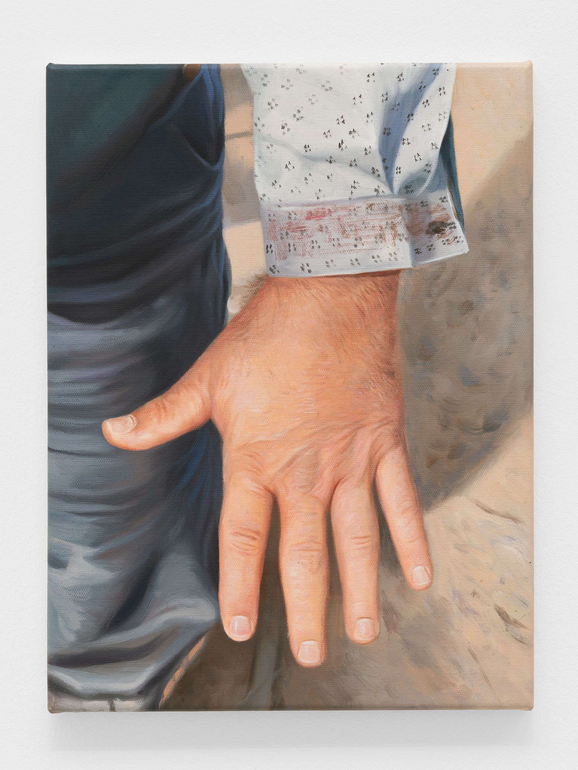 The context of these paintings—which depict police cars parked outside the film set, a gun in an evidence box, and a solitary arm with reddish marks around its shirt sleeve—is made clear by an accompanying text written by Arden, that details the incident and ensuing legal trials. Prosecutors in New Mexico dropped involuntary manslaughter charges against Baldwin in April this year, after Arden had finished the paintings. Meanwhile the trial of the film crew's armourer, responsible for the gun, Hannah Gutierrez-Reid, who has pled not guilty to involuntary manslaughter, is scheduled for later this year.