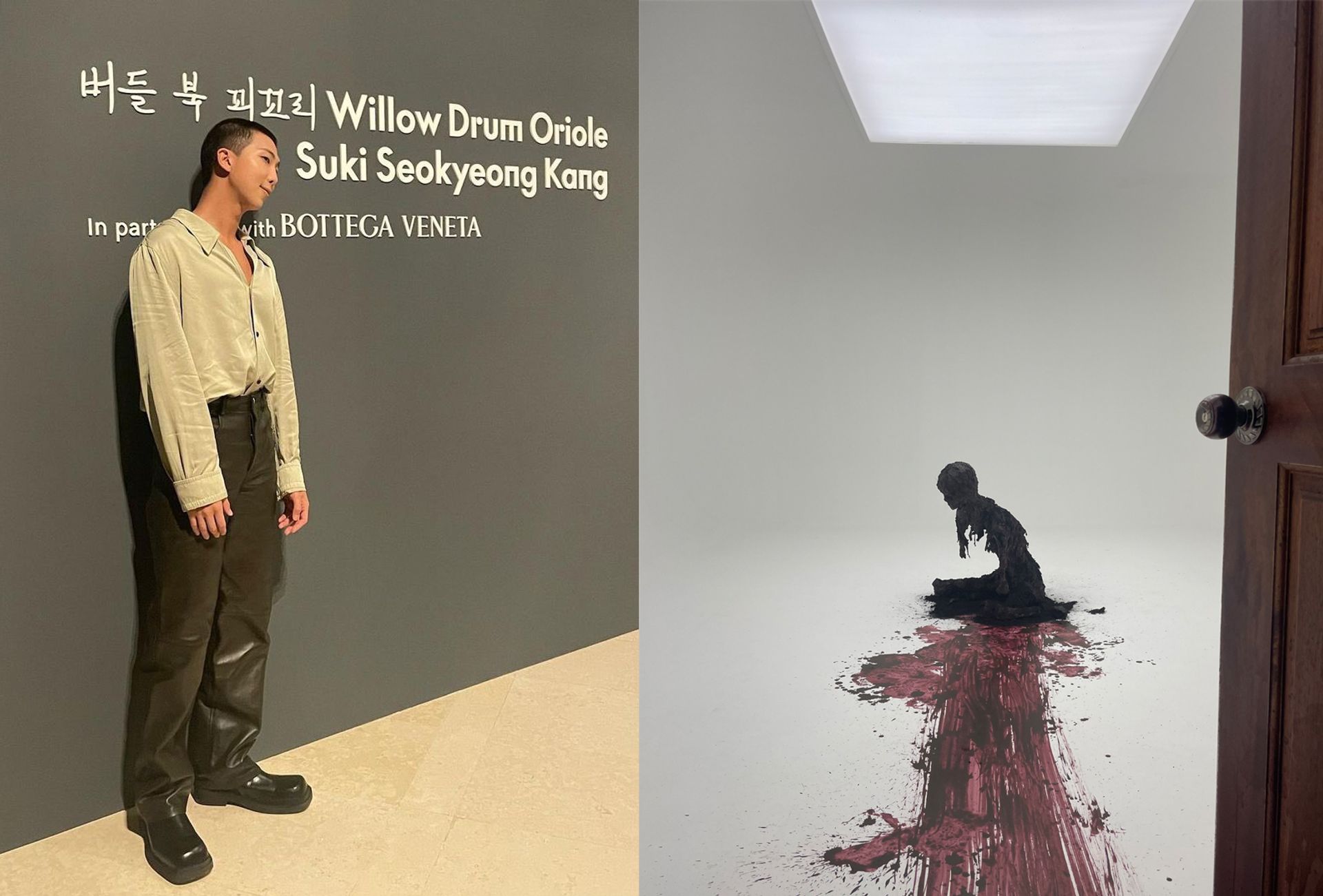 Left: BTS's RM at the Bottega Veneta Leeum Museum event on 5 Setember. Right: part of Yeon Sang-Ho's 2023 installation at Prada Double Club, Seoul