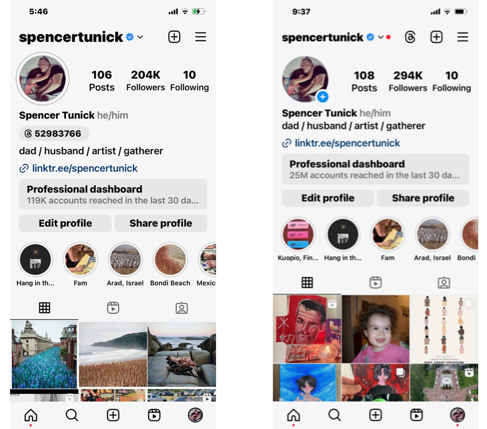Screen grabs from Spencer Tunick's verified Instagram account @spencertunick, from just before his account was suppressed, with 204k followers (left), and after he was freed from months in a violation loop, with 294k followers (right) directly after being recommendable again (2023) Courtesy of Spencer Tunick