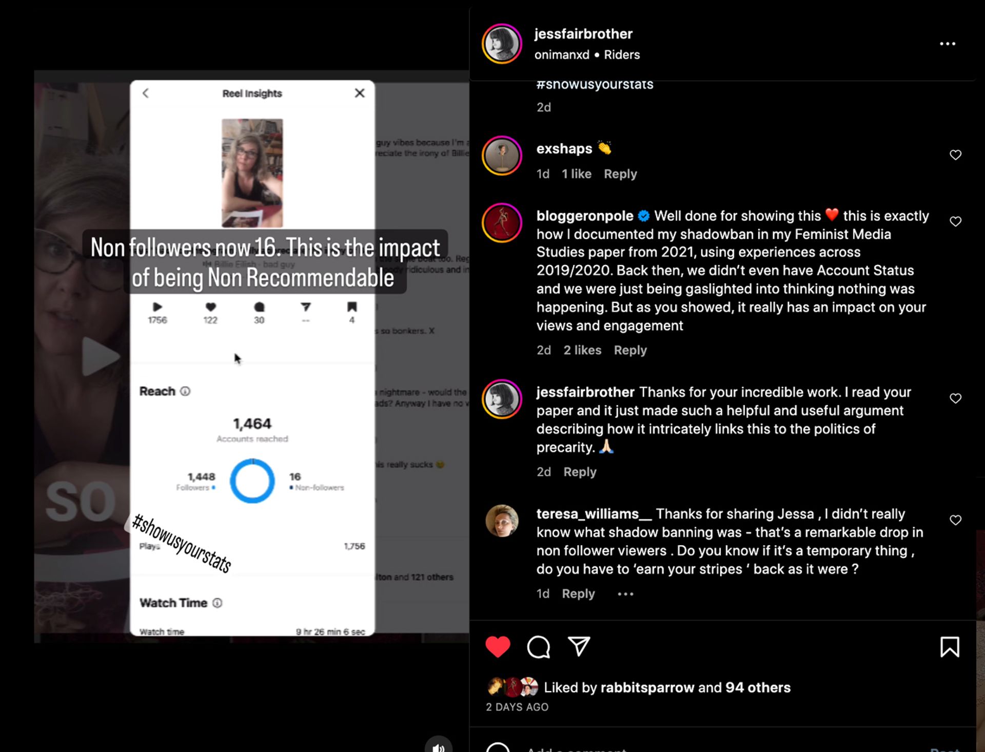 For years, artist and activists gathered proof of the existence of the shadowban by monitoring their own accounts and accumulating experiences. This labour was ultimately influential in not just uncovering it, but in the very regulations that now demand transparency. As platforms like Meta adapt, and more data becomes available, our vigilance is still required to advocate for ourselves and our community. Noting the impactful history of data collection in the art world, Fairbrother comments, “maybe every good action starts with a spreadsheet".
