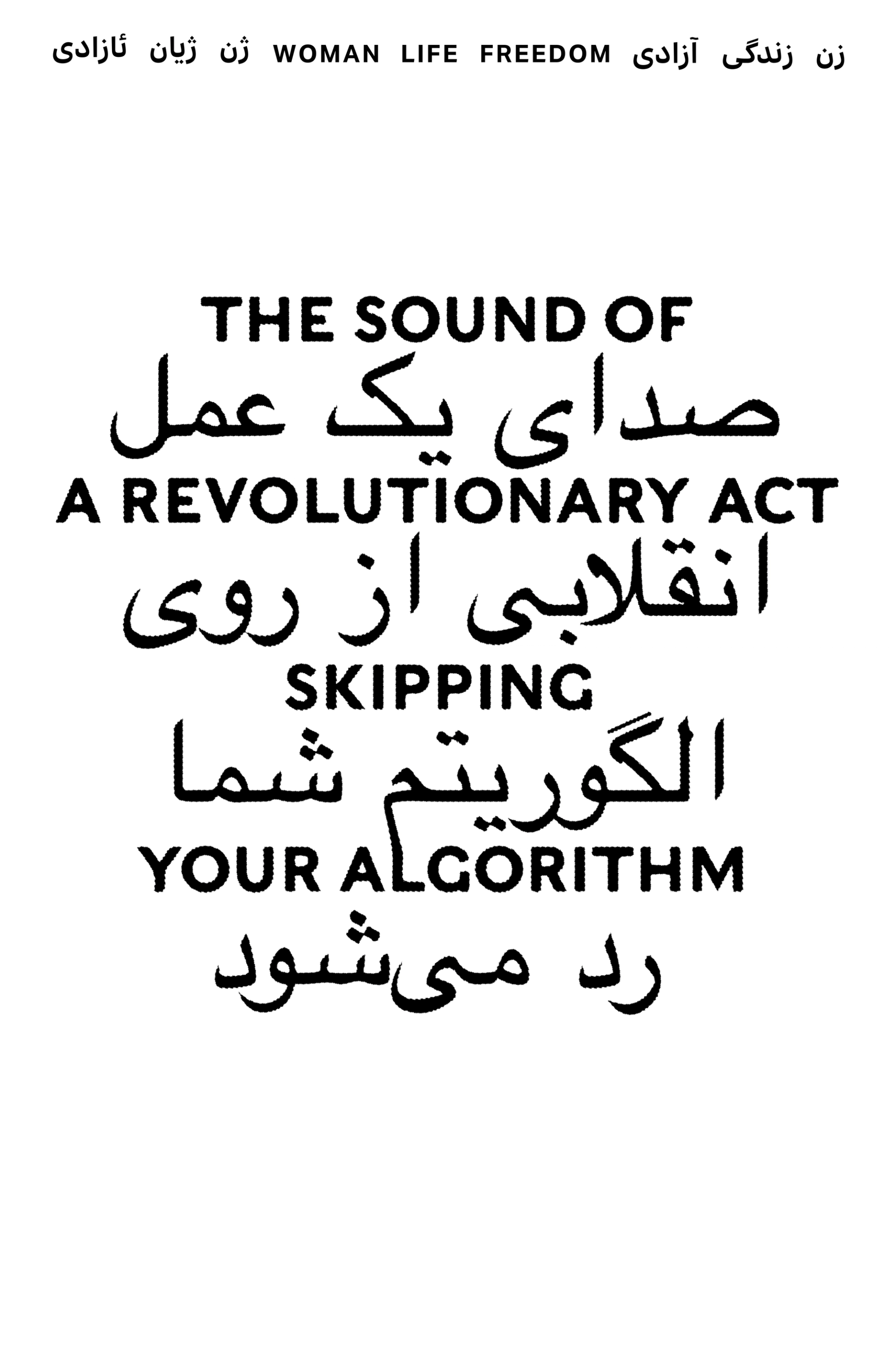 Anahita Razmi's work displays the text “The Sound of a Revolutionary Act Skipping Your Algorithm” in English and Farsi
