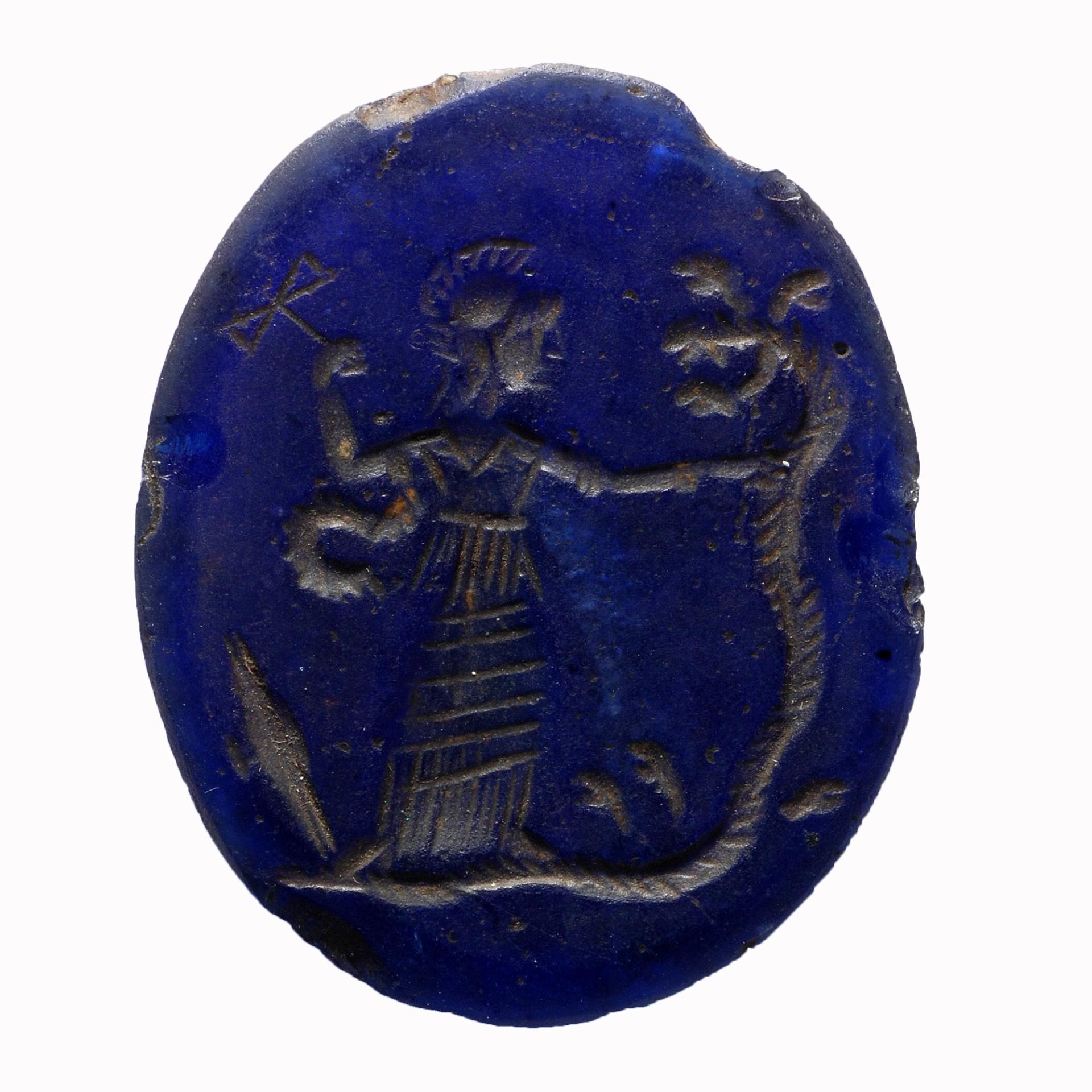 From the webpage: Blue glass intaglio, engraved with a helmeted goddess brandishing a double-axe and trampling a multi-headed snake, said to be from Ankhmim (Egypt), 2nd-3rd century AD