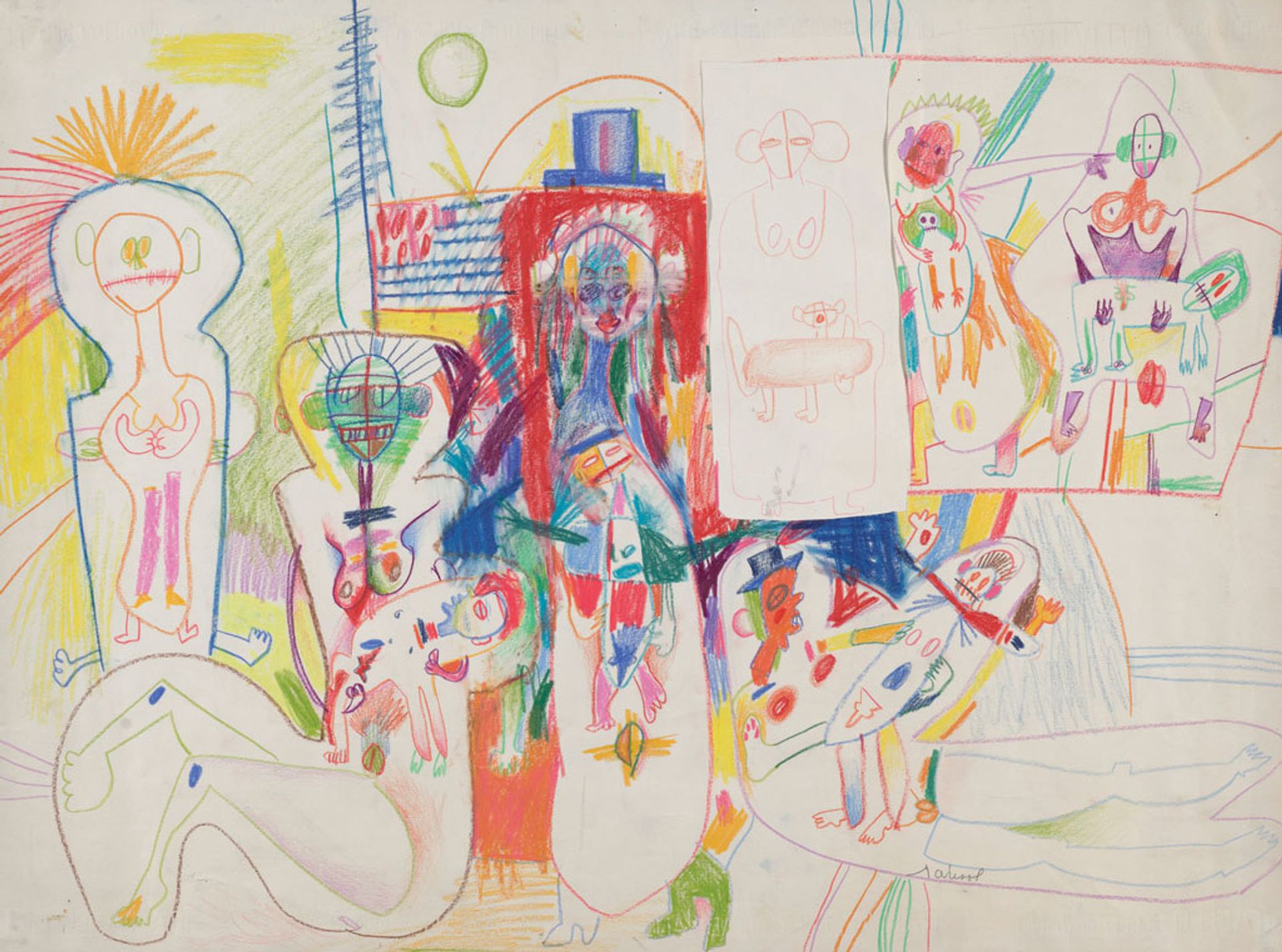 An untitled drawing by Marisol from around 1958-59 made using coloured pencil, crayon and collage on paper Collection Buffalo AKG Art Museum © Estate of Marisol / ARS, New York