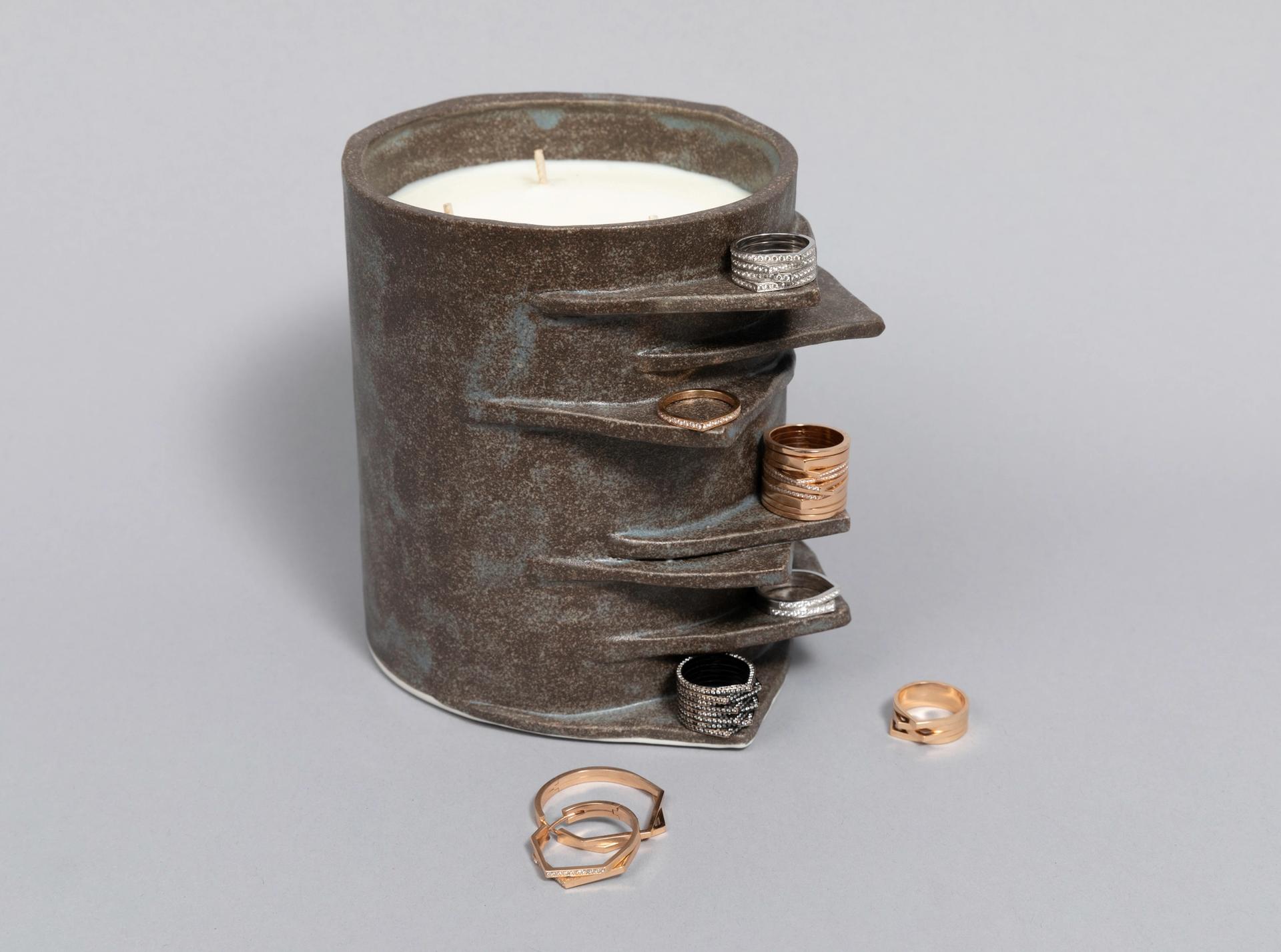 At Toklas, the new additions to the collection were displayed in glass vitrines in the centre of the room. Tributes were taken a step further, too, as Repossi revealed a new set of ceramics by the artist Martha Freud made in tribute to Antifer. Freud said in a statement that she wished to respond to the geological origins of the collection—taking it “back to that original ‘rock’ formation by working the motif back into ceramics”. She also responded to artists referenced by Antifer jewellery such as the American minimalist Donald Judd. The resulting works, which were displayed across one wall, range from stacked ring-like candles to a wall work featuring white porcelain painted on black. And a series of framed light sculptures covered in volcanic sand which, when illuminated, turn an alluring gold.