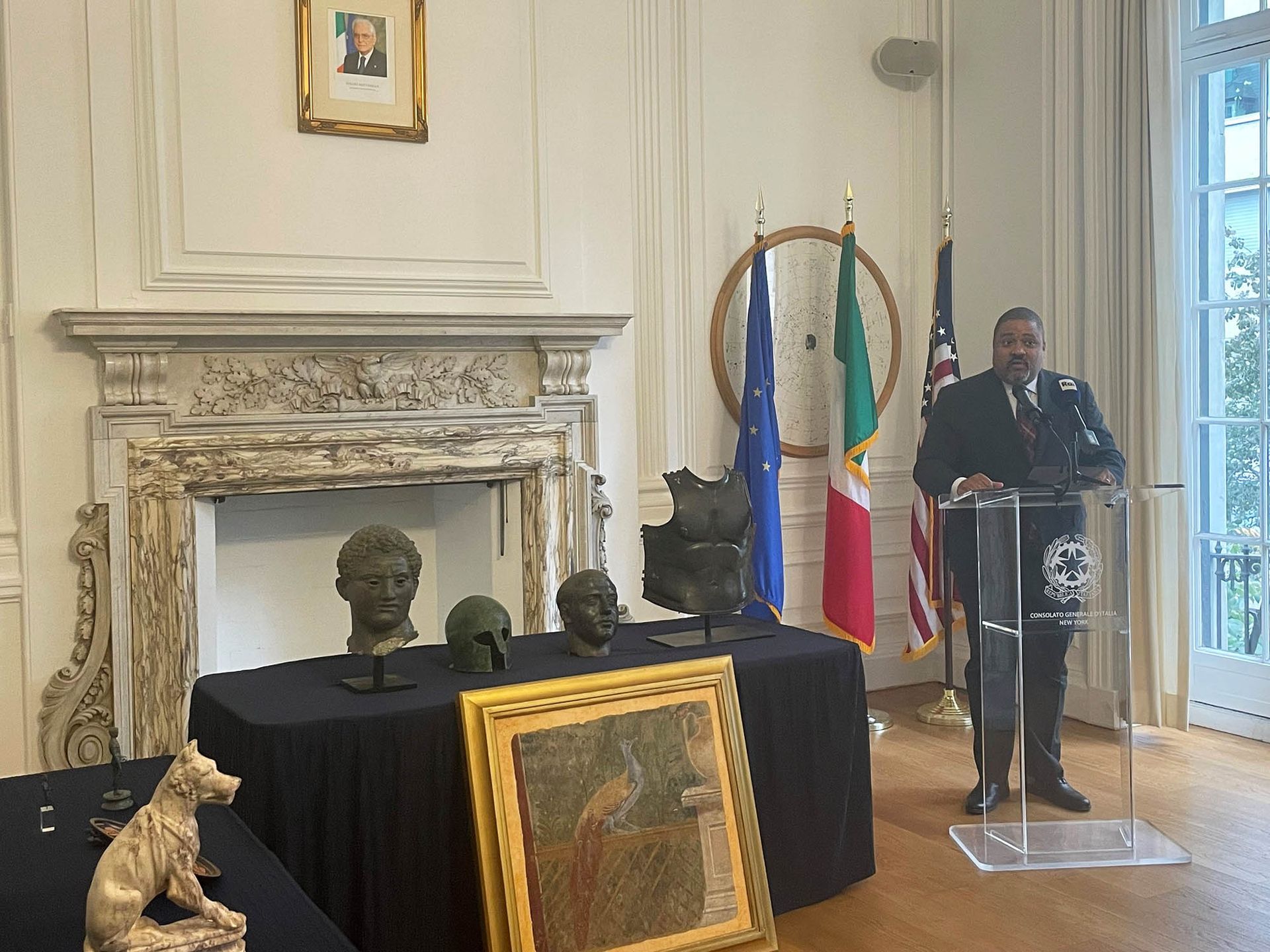 Manhattan District Attorney Alvin Bragg speaks during the 10 October repatriation ceremony at the Italian consulate in New York Courtesy Manhattan District Attorney's Office