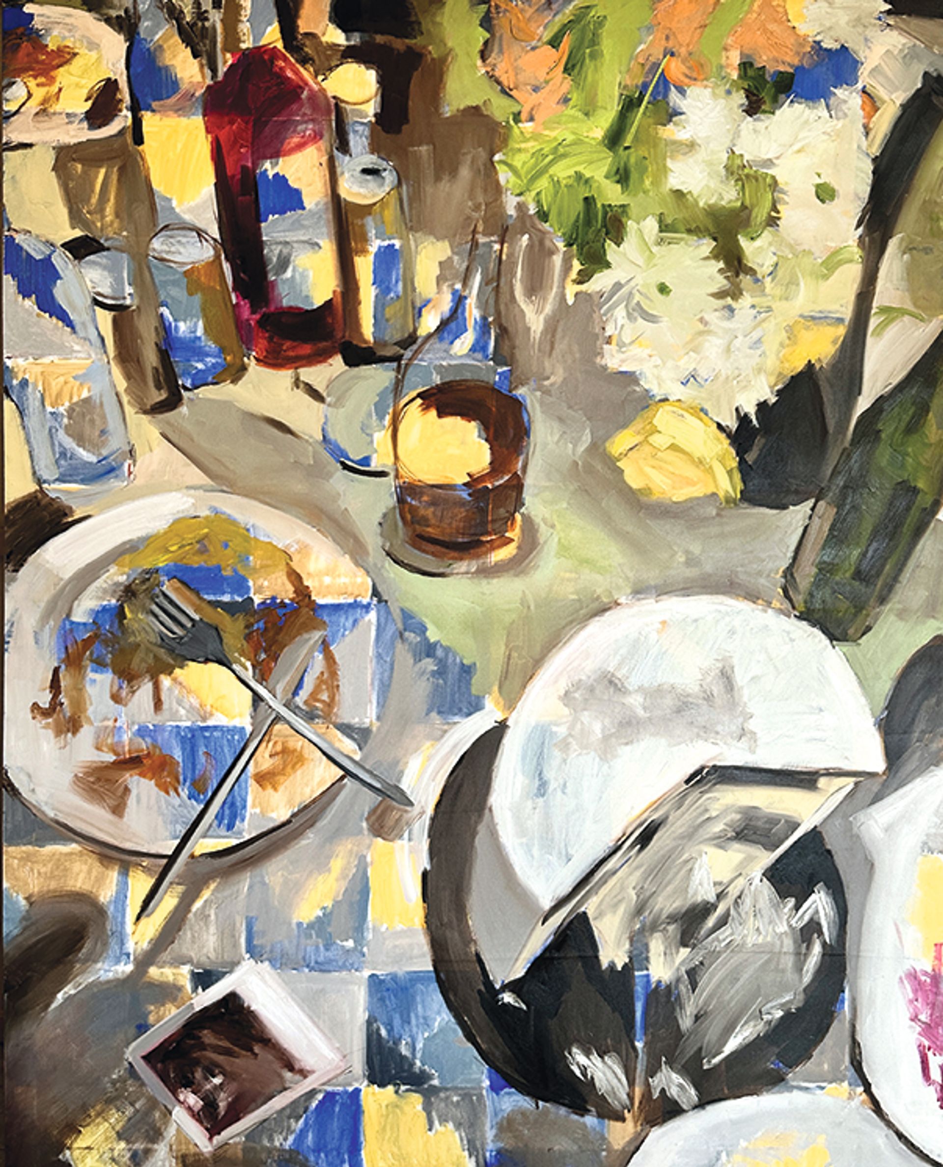 Table for you and a few (2023) is one of the paintings by Damilola Onosowobo, being shown by Lagos-based Affinity Gallery