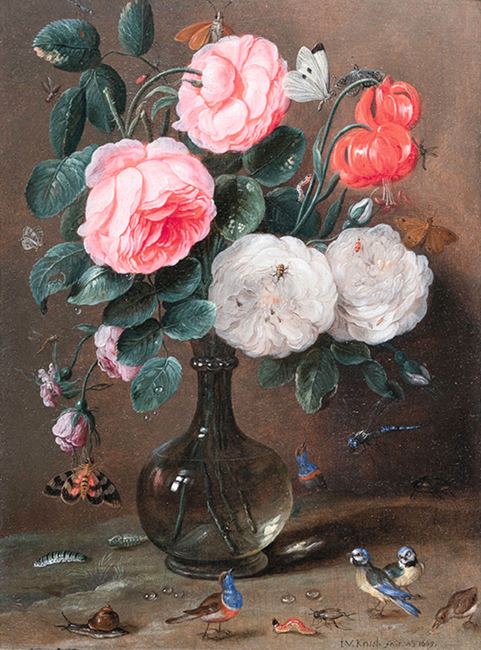 Van Kessel revels in an array of slugs and snails parading around the base of this vase. And there are also bugs and butterflies aplenty amid the rose petals and climbing the stems. Van Kessel’s paintings appealed to collectors of dead specimens (pinned on paper), who could gasp with joy at a picture in which their creepy crawlies come alive.