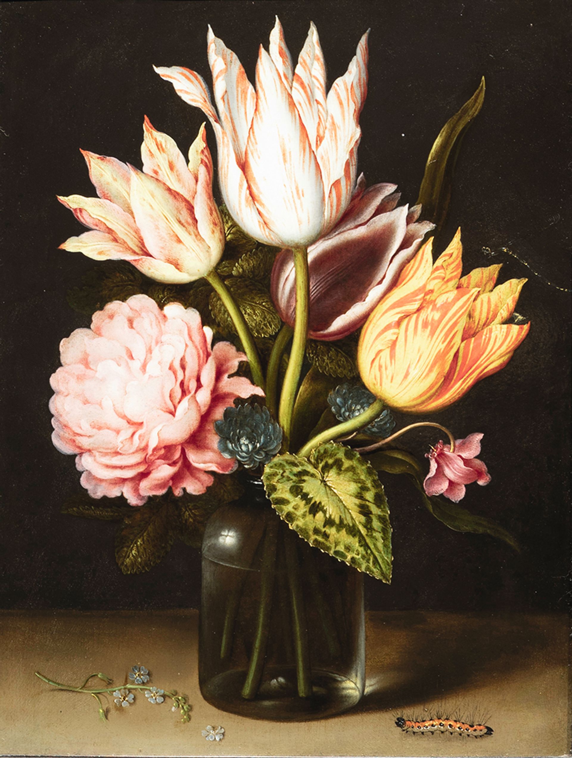 This Dutch still-life includes a hairy caterpillar, which provides a lively counterpart to a limp sprig of forget-me-not. And can you see the damselfly, a symbol of transformation, perched on one of the tulips above?