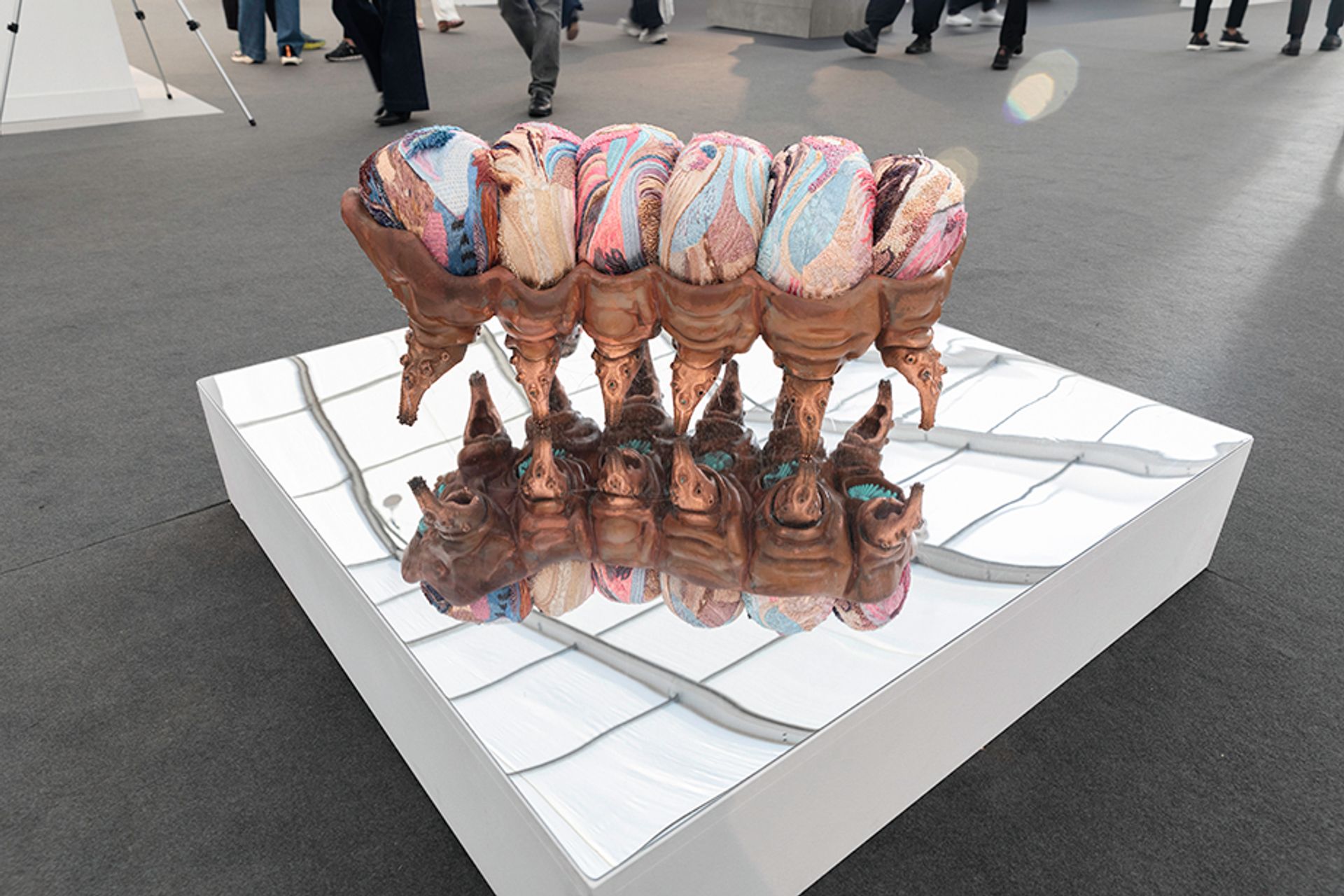 Misha Kahn’s caterpillar, made from copper, silk embroidery and cast glass also functions as a rather beautiful footstool—shoes off only. Inspired by Kahn’s dog’s close-up view of flora and fauna, the work is installed on a mirrored plinth, giving a glimpse of the bug’s sumptuously rendered underbelly.
