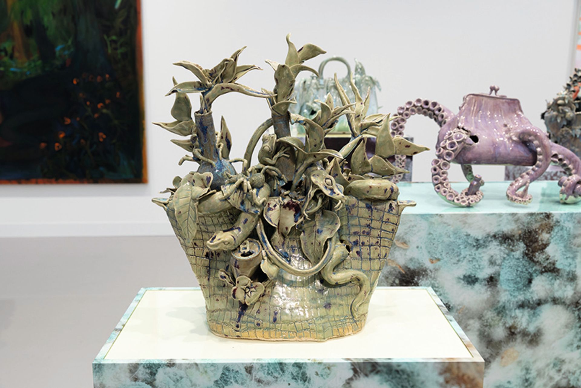 Lindsey Mendick’s installation of ceramic handbags bursting open with octopi, snakes and—in the case of Thank You For Putting Up With Me—spiders are presented on plinths designed by the artist and decorated with enlarged images of mould spores. The works are a prompt to look beneath the surface, at the messy reality of life.