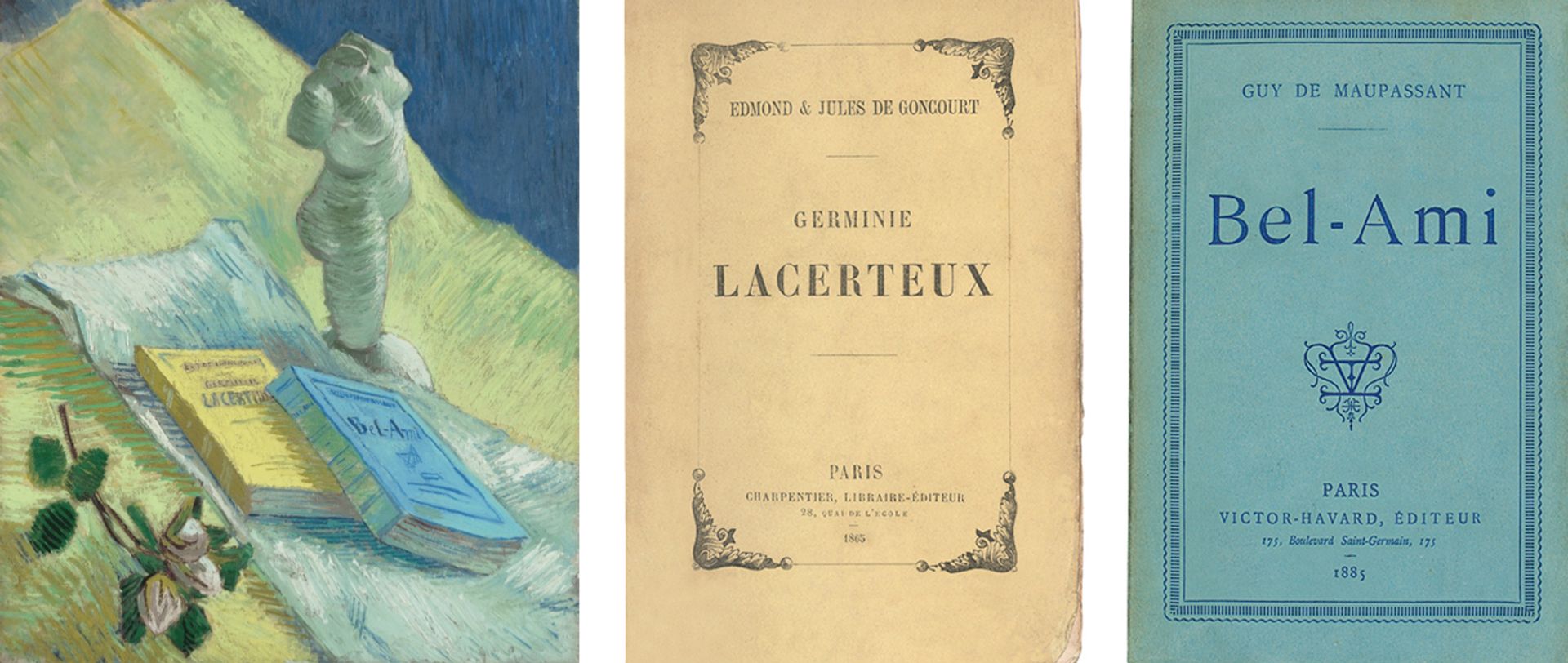 Van Gogh’s Still Life with Plaster Statuette (late 1887) with covers of Edmond & Jules de Goncourt’s Germinie Lacerteux (1865) and Guy de Maupassant’s Bel-Ami (1885)