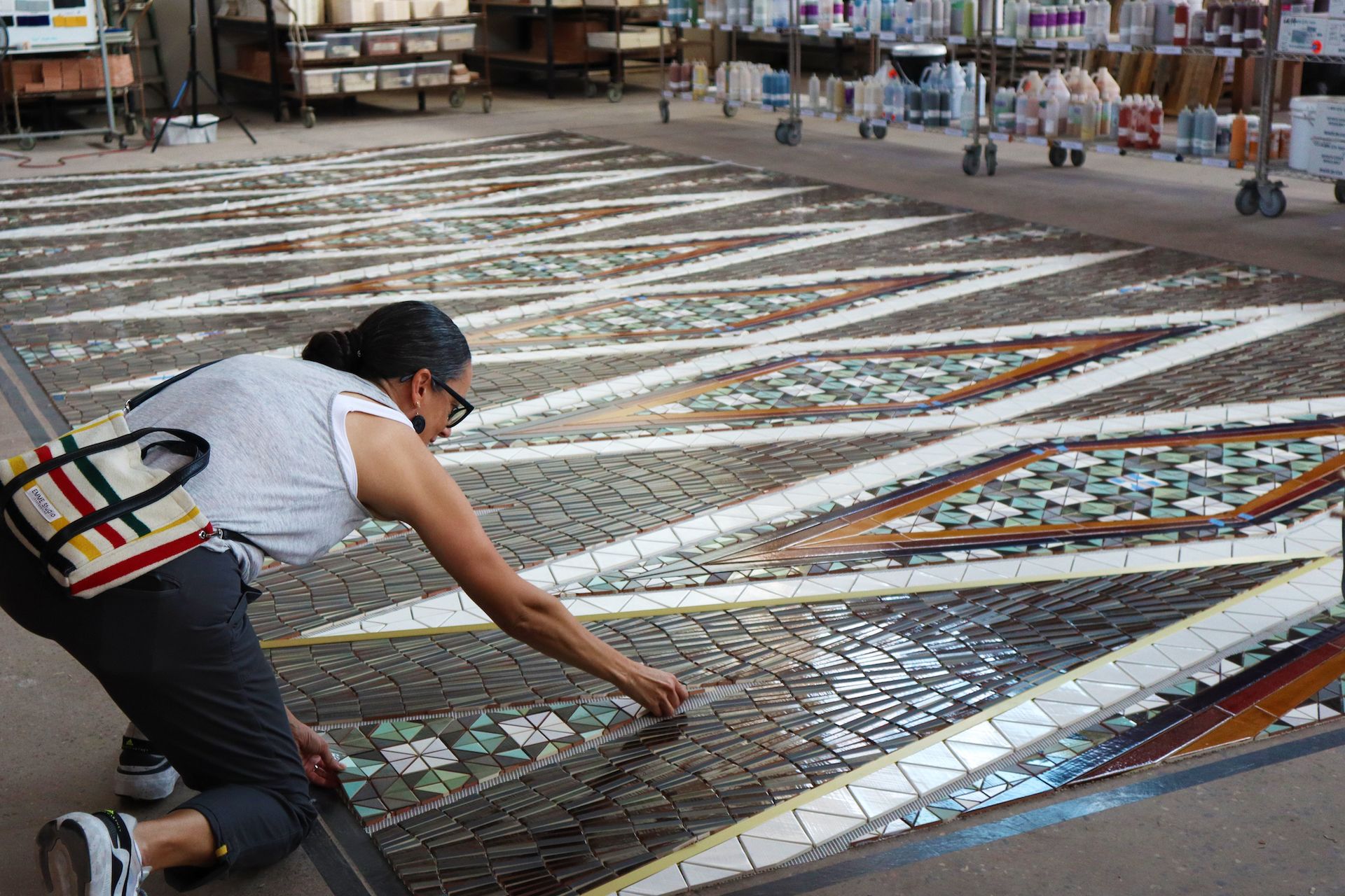 Dyani White Hawk working on her mosaic for the Whitney Museum café Courtesy the Whitney Museum of American Art