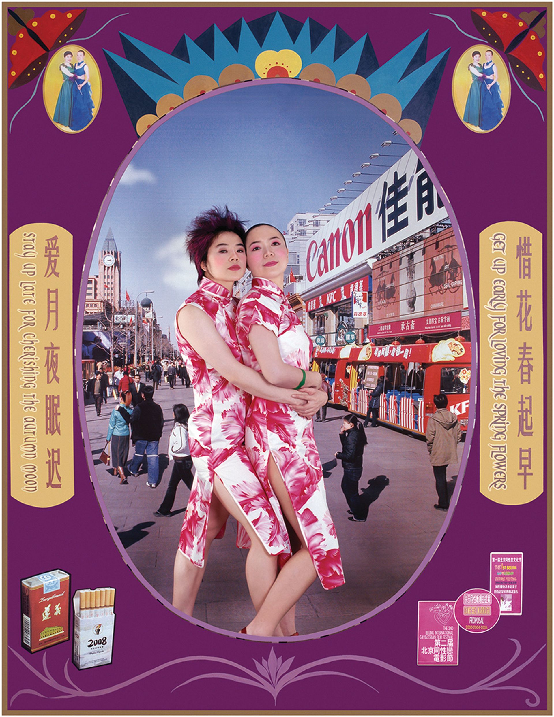 Both Queer and feminist art emerged in the heady 1980s, with Xiao Lu’s 1989 “Dialogue” still a resounding feminist statement. China’s first all-women contemporary art show, The Female Artists’ World, was held in May 1990 at Beijing’s Central Academy of Fine Arts. Active in Beijing’s East Village since 1993, Ma Liuming was arrested for his gender-bending performance art in 1994. In 1995, the United Nations World Conference on Women was held in Beijing, sparking both feminist and queer discourse, although records were erased about its lesbian tent, as Wei Tingting discovered when researching her 2015 documentary, We Are Here.