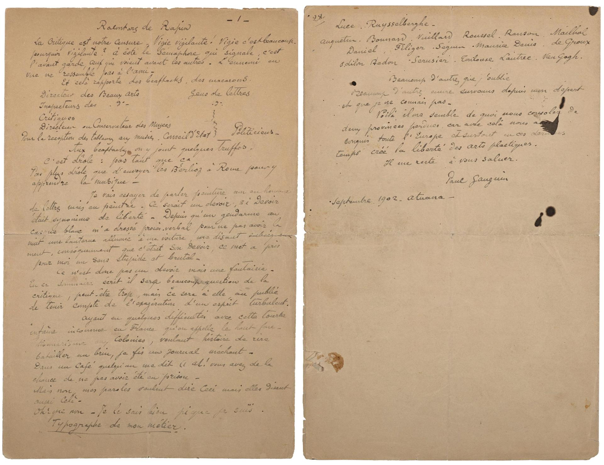 The Courtauld Gallery has bought the last literary manuscript by Paul Gauguin remaining in private hands. Written in 1902 on the remote Marquesan island of Hiva Oa in French Polynesia, it is bitter denunciation of critics who do not understand Modern art. It was submitted for publication in the radical journal Mercure de France, but rejected by its editors.