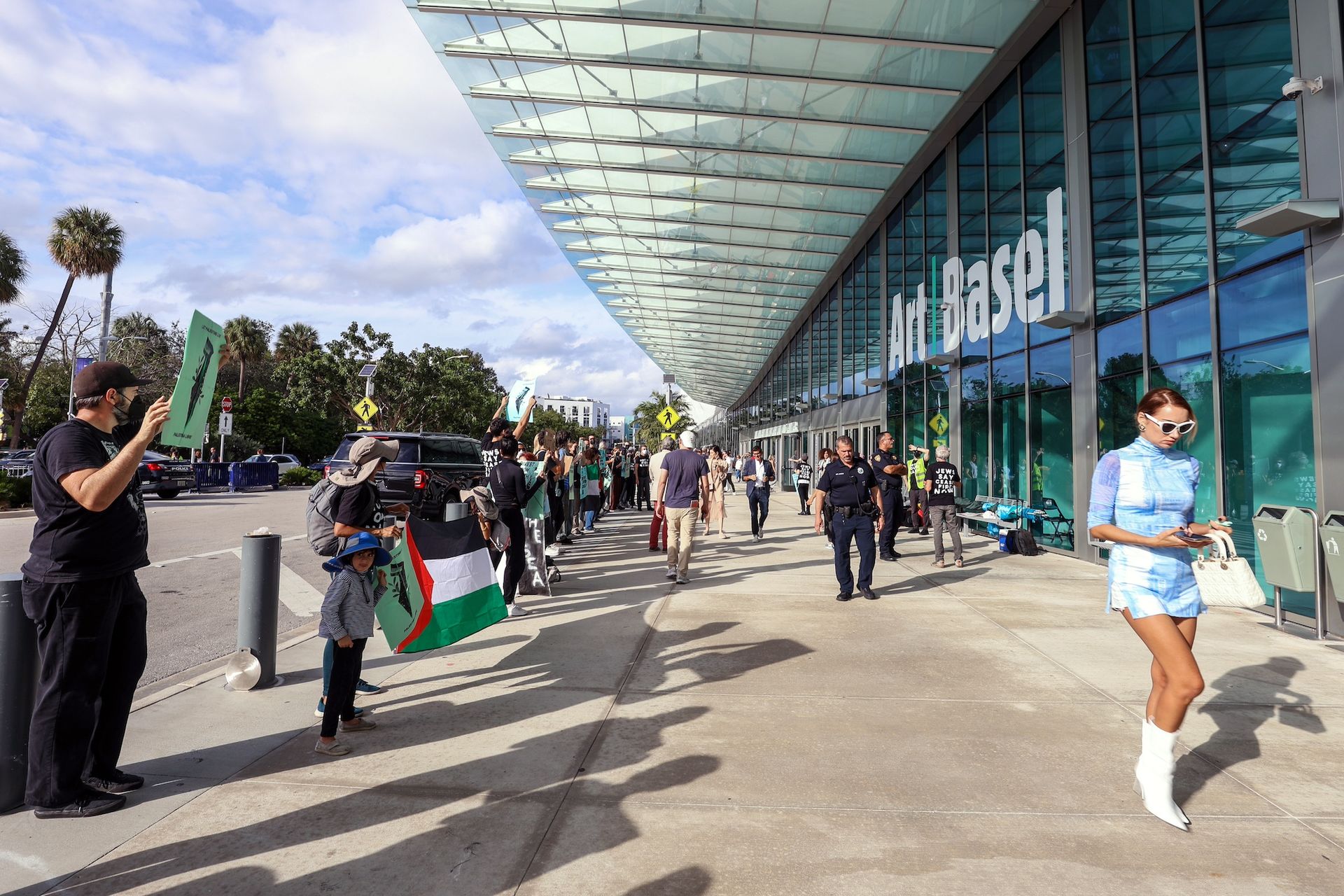 More than 100 Miami-based artists and members of the South Florida Coalition for Palestine, which includes groups such as the Jewish Voice for Peace, gathered outside Art Basel in Miami Beach on Friday afternoon to protest what they describe as “Israel’s genocidal campaign” against Palestinians in Gaza.