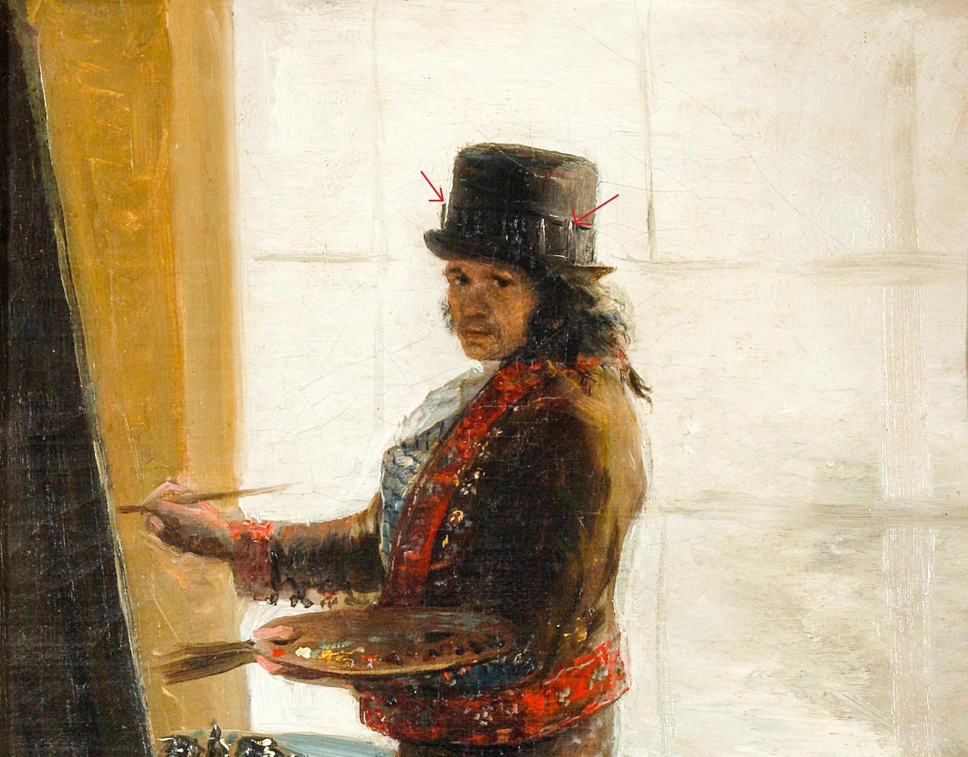 Detail of Francisco Goya’s Self-portrait at the Easel ( early 1790s); (candles indicated with red arrows)