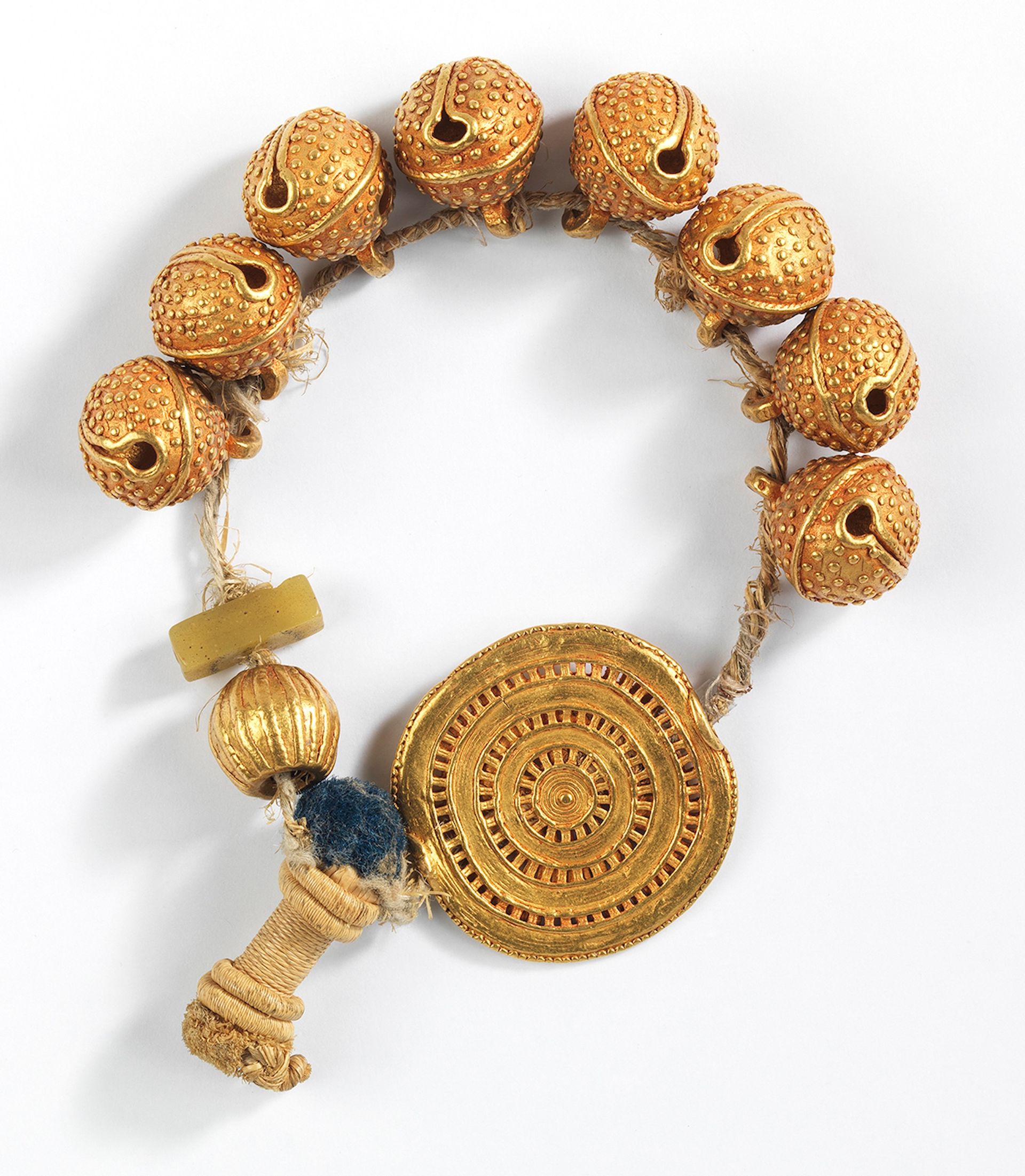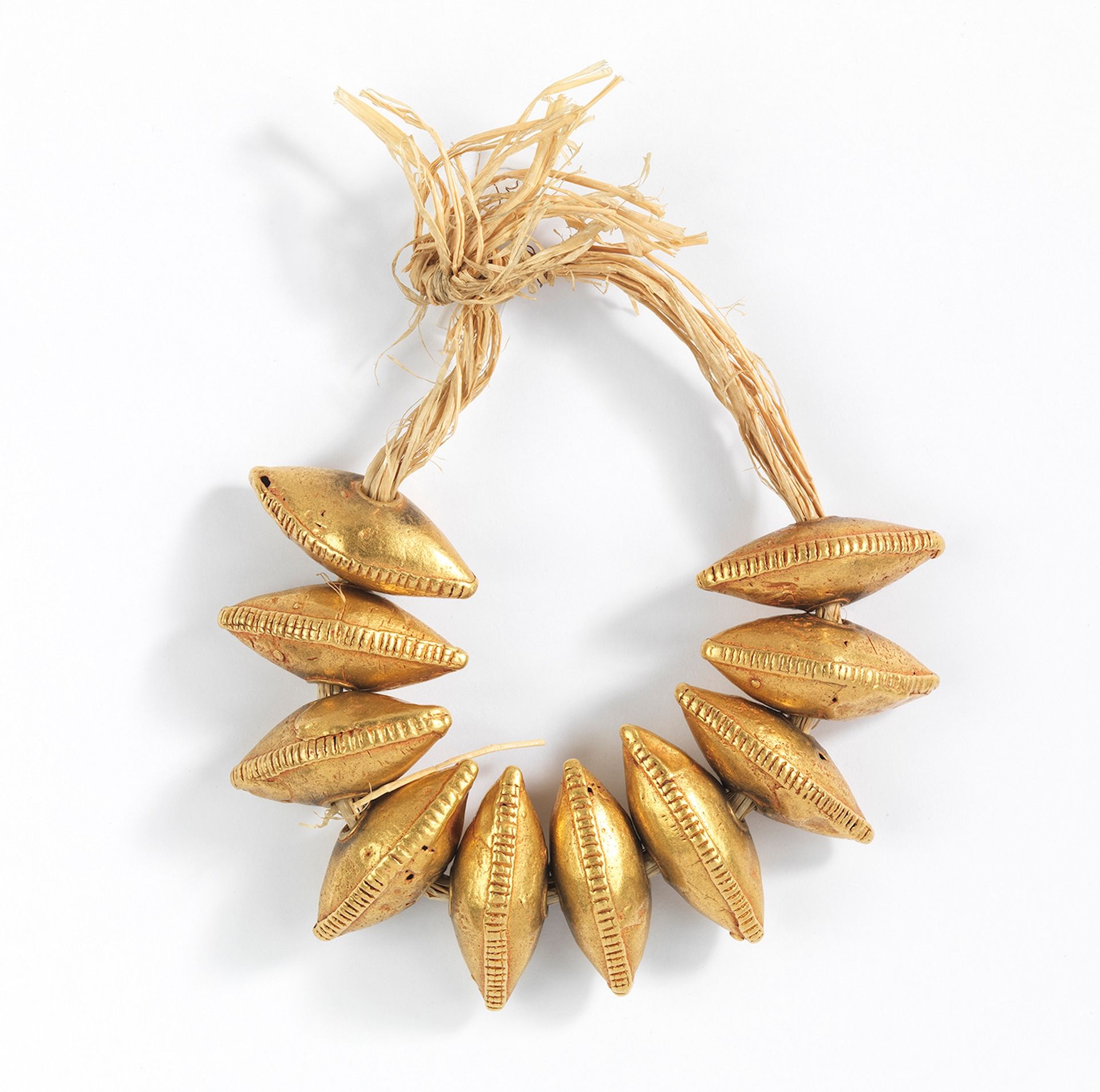 Unidentified member(s) of gold workers' guild (Asante peoples, Kumasi, Ghana), ten large beads worn as bracelet or anklet, before 1874, gold and cordage fiber Fowler Museum at UCLA, Gift of the Wellcome Trust