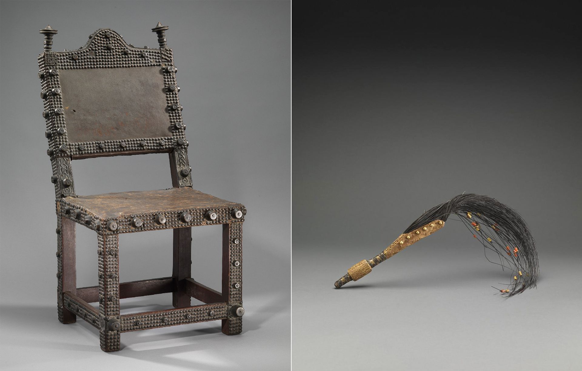 Left: Unidentified artist(s) (Asante peoples, Kumasi, Ghana), Asipim (ornamental chair), before 1874, wood, brass, iron and leather. Right: Unidentified artist(s) (Asante peoples, Kumasi, Ghana), Sika Mena (elephant tail whisk), before 1874, gold, elephant hair, glass and silver. Both Fowler Museum at UCLA, Gift of the Wellcome Trust