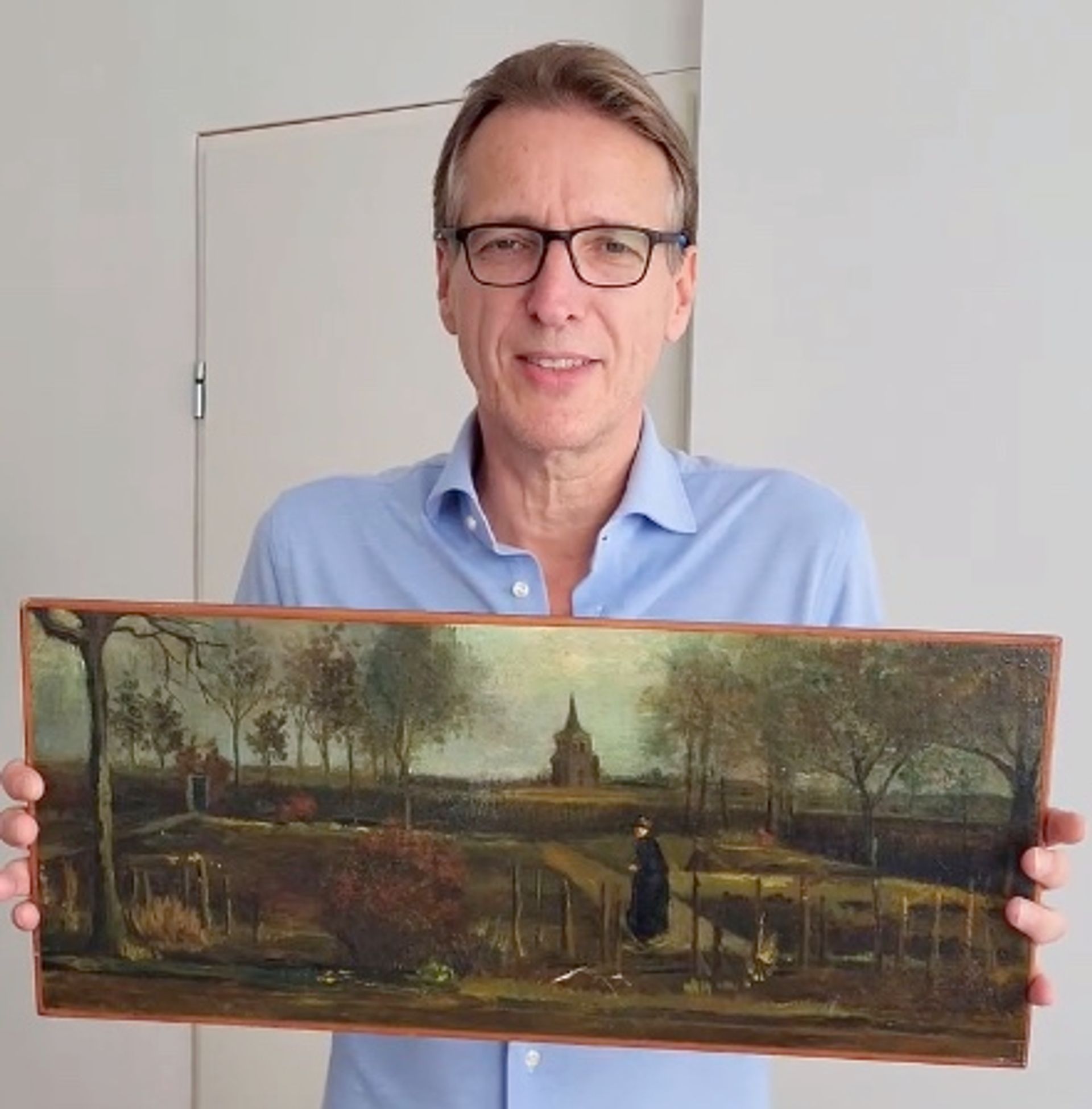 Dutch art detective Arthur Brand with Van Gogh’s The Parsonage garden at Nuenen in Spring, a few minutes after its recovery on 11 September 2023