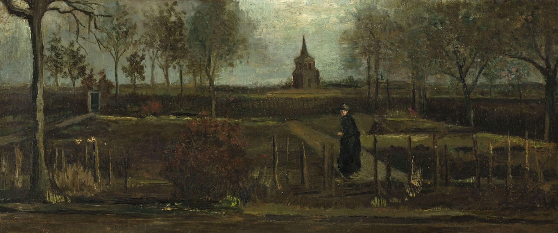 The landscape, painted in Van Gogh’s early, dark tones, was created when he was living with his parents in the village of Nuenen, in the south of the Netherlands. It depicts the back garden of his father’s parsonage, with the tower of the old church in the distance. The figure of a woman, dressed in black, is shown walking away.