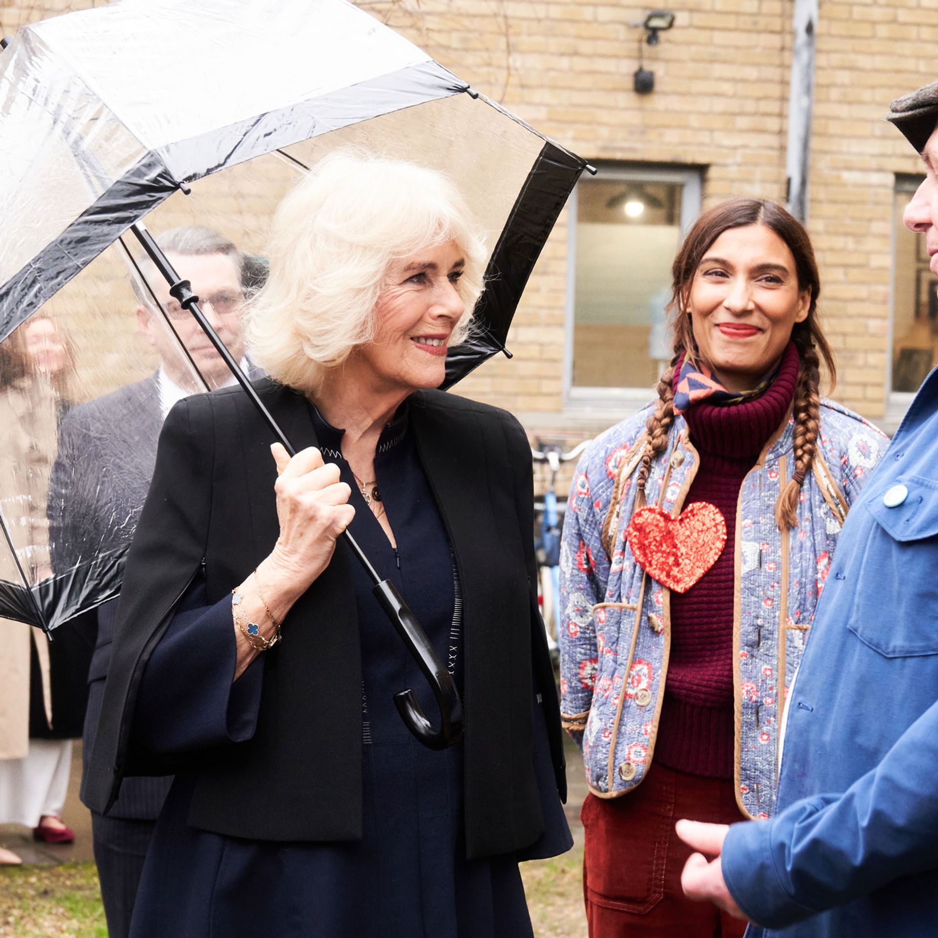 One of her first conversations was in front of a courtyard mural with the artist Jon Rees, who had previously lived in the building when it was a homeless charity run by the charity St Mungo's, and now acts as a mentor to young artists at Kindred. After visiting four further artists in their studios—including the abstract artist Michèle Jaffé-Pearce, with whom she discussed the relative challenges of working in oils and watercolours—the Queen returned to the courtyard, and a light February drizzle, to be regaled with folk singing by a Bulgarian choir who use the centre for their rehearsals.