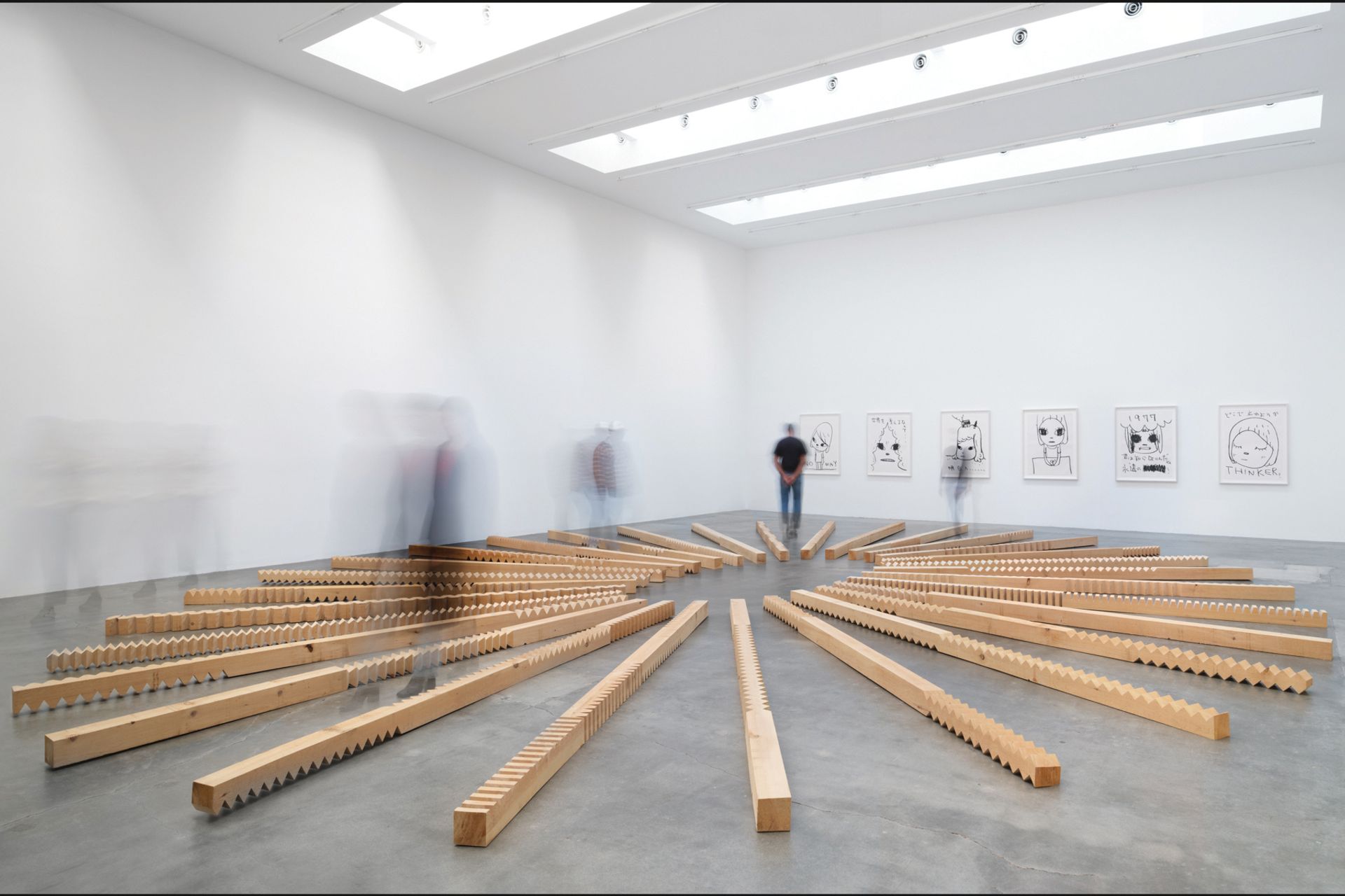 The show begins with a 2019 riff on Jasper Johns’s Three Flags (1958) by Yukinori Yanagi, which takes the form of a plastic box filled with coloured sand representing the red-and-white stripes of the US flag, sand in which ants make their home—and carve various paths. Here, the idea of artists as worker ants and the notion of artists as iconoclastic image-destroyers work hand-in-hand. The first major room has more sand boxes by Yanagi, along with a show-stopping sculpture from 1972 by Mono-ha artist Susumu Koshimizu made with 30 wooden beams, carved in geometric patterns, arranged on the floor in a radial pattern—an organic (and thus warmer) counterpart to the steely minimalism of Carl Andre and Donald Judd.
