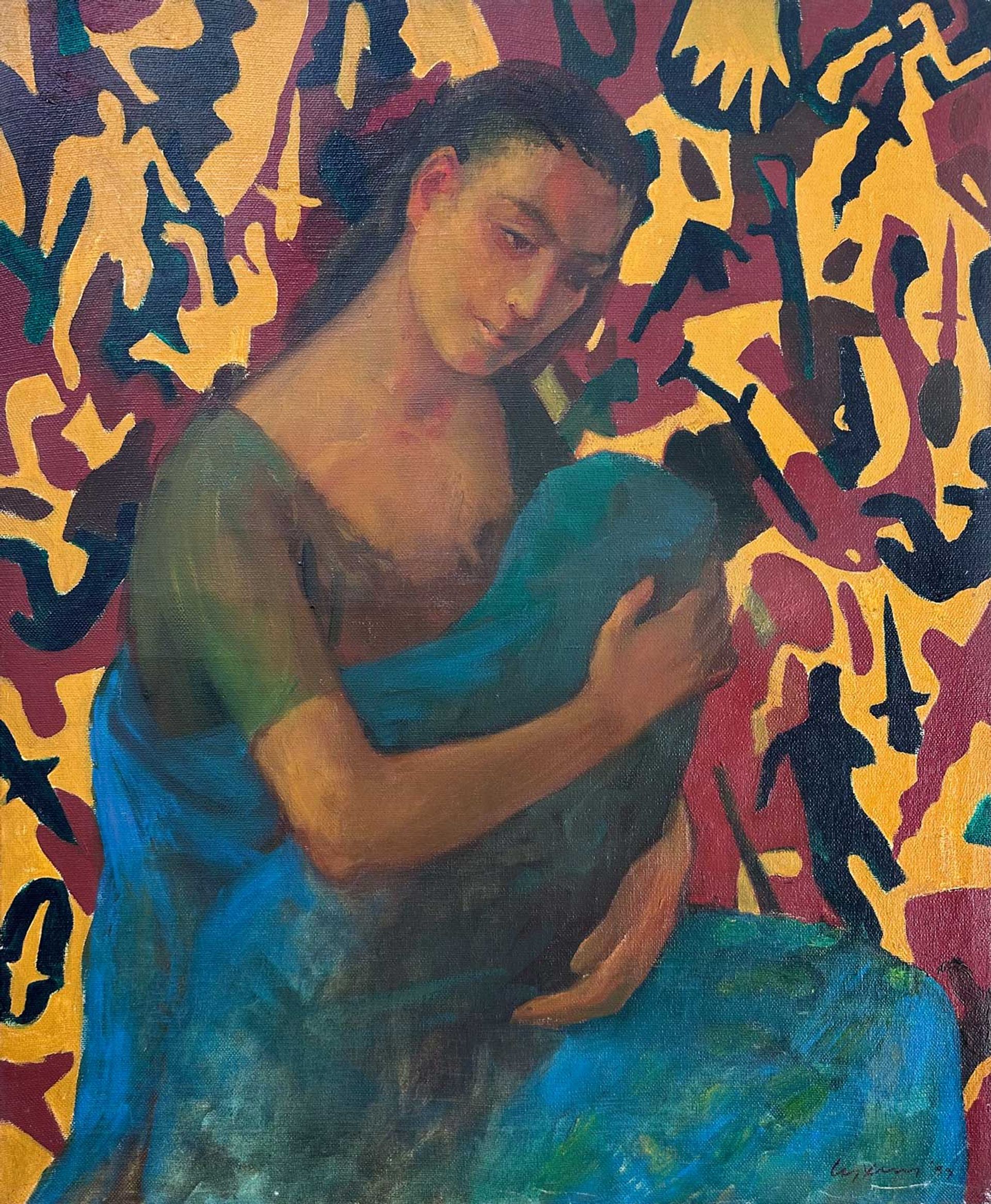 This painting draws on the mother-and-child archetype of Eastern Orthodox icons, but in place of the traditional gold background, Chandraguptha Thenuwara adds camouflage—a prevalent motif in his practice that alludes to the common use of camouflaged barrels at military checkpoints during the civil war in Sri Lanka. The child’s hidden face, pressed against its mother’s chest, reflects the protective peace of a mother-child relationship, nevertheless unsettled by a war-time pattern with daggers in the background.
