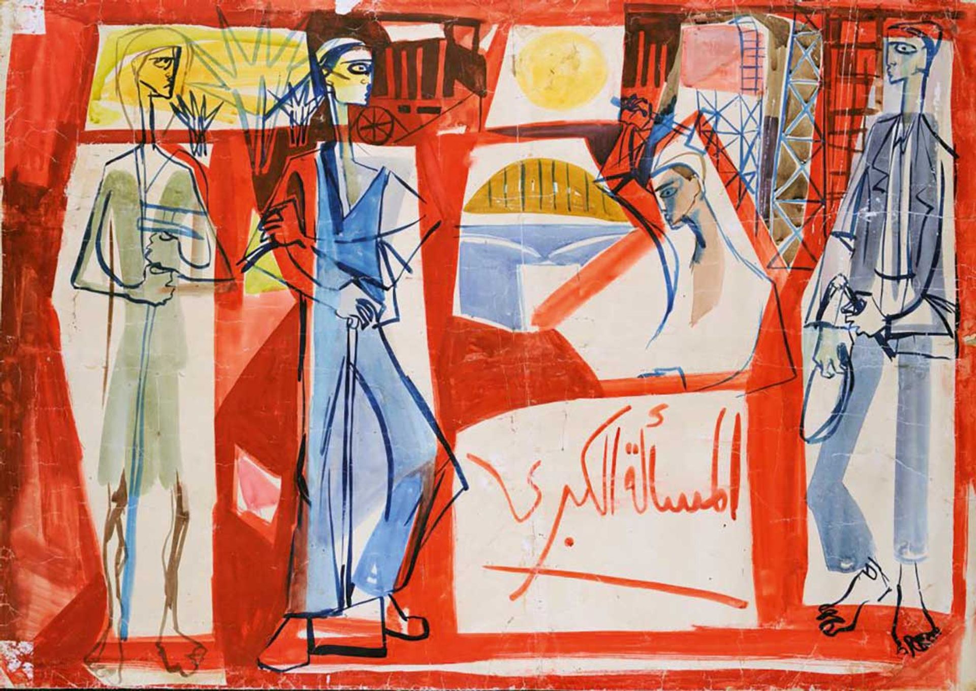 Mahmoud Sabri’s strong contour lines and primary blocks of colour give structure to this scene of four workers. Behind them, a rail car and scaffolding suggest a construction site, while one figure lifts a hammer, intent on pounding it against the Arabic word “Al-Mas’ala Al-Kubra” (المسألة الكبرى), or the “main question”. Well-versed in Marxist art and culture, and engaged in the political transformation of his birth country of Iraq, Sabri’s works interlace abstract aesthetics with realistic and symbolic references—the industrialisation of Iraq in the mid-20th century, as well as a worker in local dress holding a shovel, and a suit-clad man holding a sickle, setting up a comparison between “traditional” and “modern” labour.