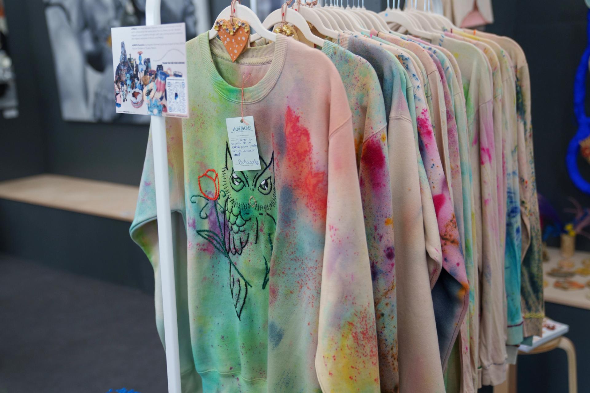 The stand also includes clothing embroidered by shelter residents and dyed by Ambos founder Tanya Aguiñiga, who is also an artist